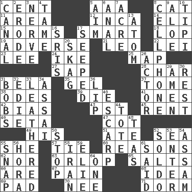 ACROSS 1. Penny 5. Auto club (abbr.) 8. Feline 11. Type of rug 12. South American Indian 14. Connecticut Ivy Leaguer 15. Typical models 17. Don Adams' spy role 18. Chop off 19. Contrary to your interests or welfare 21. Lion 22. Flowery wreath 23. Area sheltered from the wind 24. Eisenhower's nickname 25. Atlas unit 27. Plant excrement 28. Burn to charcoal 31. Actor Lugosi 35. Set 37. Heavy book 38. Lyric poems 39. Pass on 41. Washington bills 42. Prejudice 43. Pacific Standard Time (abbr.) 45. Monthly bill 46. Bristle 47. Small bed 49. Part of HMS, perhaps 51. Had dinner 52. Ocean 55. A female animal or person 57. Standoff 60. Thinks logically 62. Or not 63. Lowest deck of a ship 65. Table seasonings 66. "We ___ not amused" (Victoria) 67. Ache 68. The main thing one is thinking about 69. Groovy apt. 70. Born 71. Dormintory (informal) DOWN 1. Lessep's creation 2. Eat (away) 3. Boldness 4. Docile 5. Direct toward a target or goal 6. Of or related to the anus 7. Measure of real estate 8. Portable communications device 9. Medicinal plant 10. Native american tent (variation) 13. Tiny particle 16. Indian titles of respect 17. Oozed 20. Heroin 26. Thespian 29. So be it 30. Respite 31. Moves up and down 32. Singer Brickell 33. Resembling or made to resemble leather 34. Slender Brazilian palm 36. Mouth edge 40. Fortification 44. Lug 48. Beverages made from leaves 50. Constrict 52. Twentieth part of a lira 53. Keyboard key 54. Indian state 55. Fastener 56. Israeli folk dance 58. SW Asia republic 59. Writer Wiesel 61. Expressed in words 64. Single