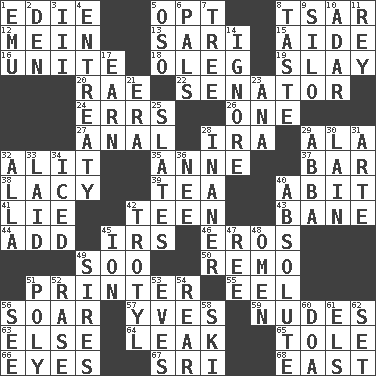 ACROSS 1. Singer Brickell 5. Elect 8. Russian ruler of old 12. Count _ (2 wds.) 13. Indian skirt 15. Assistant 16. Join together 18. Cassini of fashion 19. Kill 20. Actress Charlotte 22. Elected representative 24. Blunders 26. Single 27. Of or related to the anus 28. Retirement account (abbr.) 29. In the manner of 32. Came down and settled, as after flight 35. Queen of England 1702-14 37. Tavern 38. Made of lace 39. Afternoon social gathering 40. "This won't hurt ____!" 41. Whopper 42. Adolescent 43. Object of repulsion 44. Increase 45. Big collection agency 46. Greek god of love 49. "Barney Miller" actor Jack 50. San ____ (Riviera town) 51. Hard copy producer 55. Snakelike fish 56. Fly high 57. Jacques Cousteau's middle name 59. Unadorned figures 63. Otherwise 64. Path through which fluid escapes 65. Lacquered or enameled metalware 66. Snake ____ (dice throw) 67. _ Lanka 68. 90 degrees DOWN 1. Australian flightless bird 2. Lair 3. One more than two 4. Plea 5. Bear (Spanish) 6. Friends 7. Relationship diagram 8. Clothes sense 9. Grain storage tower 10. The sixth month of the Jewish calendar 11. Marina Del _, California 14. Dismiss 17. Merit 21. Epoch 23. Santa ___, CA 25. Chalkboards 28. Sillier 29. Swedish rock group 30. (Had) reclined 31. Johnson of "Laugh-In" 32. Silent film actress Nazimova 33. Put down 34. On the rocks 36. Born 40. Utter; complete 42. Trinitrotoluene 45. Electrically charged atom 47. To separate or throw off 48. Sign of something about to happen 49. Begets 51. Much (prefix) 52. Raze (variant) 53. Nights before holidays 54. Bring up, as a child 56. Observe 58. What Jean-Claude Killy likes to do 60. ___ good deed 61. Raised railways 62. Put into a specified state