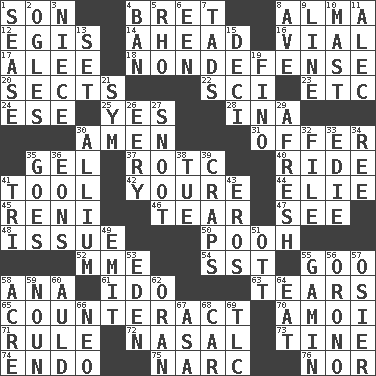 ACROSS 1. Male offspring 4. Cy Young winner Saberhagen 8. _ mater 12. The front part of a cuirass 14. Toward the future 16. Small bottle 17. Toward shelter 18. Unrelated to defense, as in spending 20. Religious groups 22. _-fi 23. And so on (abbr.) 24. Compass dir. 25. Affirmative reply 28. _ tizzy (2 wds.) 30. So be it 31. Auction bid 35. Set 37. College mil. group 40. Travel on or in a vehicle 41. Implement 42. You are 44. Writer Wiesel 45. Painter Guido (1575-1642) 46. Pull apart 47. Perceive with the eye 48. Come out of 50. "Silly old bear" 52. Madame (abbr.) 54. Fast jet (abbr.) 55. Thick or sticky substance 58. Santa ___, CA 61. Wedding promise 63. Pulls apart 65. Act in opposition 70. Mine, in Marseilles 71. Governing power 72. Rhinal 73. Prong on a fork 74. Inside; within (prefix) 75. Drug cop 76. Or not DOWN 1. Gospel singer Marvin 2. Stares at amorously 3. Sibling's daughter 4. Forbid 5. 17th letter of the Greek alphabet 6. Car or cant ending 7. Small boys 8. "___ Maria" 9. Actor's bit 10. Vertical spar for supporting sails 11. Actor Baldwin 13. Put into a specified state 15. Tenth: prefix 19. Fine (Spanish) 21. Symbol (abbr.) 26. Suggestive of the supernatural 27. Snob 29. Anew 30. Plant genus of onion and garlic 32. Do some clerical work 33. Singer Brickell 34. To separate or throw off 35. Leaves 36. Immeasurably long periods of time 38. Third day of the wk. 39. Dice game 41. Three (prefix) 43. Greek god of love 49. Send forth 51. Baseball player Mel 53. Genesis locale 55. Homeless child 56. U. of Maine site 57. Flexible twig of a willow tree 58. Measure of real estate 59. Part of speech 60. Old (Scot.) 62. Northwest Algerian city 64. Ingest 66. Modern: prefix 67. White ___ sheet 68. Automobile 69. Affectionate concern, for short