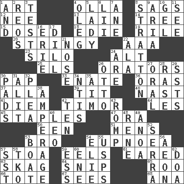ACROSS 1. Tate display 4. Rounded earthenware pot or jar 8. Droops 12. Born 13. (Had) reclined 14. Relationship diagram 15. Administered medicine 18. Singer Brickell 19. Cause heat under the collar 20. Slender, wiry 22. American Automobile Association (abbr.) 23. Grain storage tower 24. The first octave above the treble staff 25. Raised railways 26. Speakers 30. Infant food 33. Maternal 36. Mouths or openings 37. Silent film actress Nazimova 39. Teat (slang) 40. Political cartoonist Thomas 41. South Vietnam president (1954) 42. The easternmost of the Lesser Sundas 44. French article 45. Paper fasteners 47. Mouth or opening 50. Car or cant ending 51. Not women's 53. Sis' sibling 54. Normal relaxed breathing 57. Portico 59. Snakelike fish 61. Having ears or earlike features 63. Heroin 64. Sever or remove by pinching or nipping 65. Friend of Pooh 66. Haul 67. Perceives with the eye 68. Santa ___, CA DOWN 1. Also 2. Vintage cars 3. Trials 4. Cassini of fashion 5. Kenny Rogers chart-topper in '80 6. Cards in a Roman deck? 7. A saturated hydrocarbon 8. Ski resort town in Vermont 9. Operatic vocal solo 10. Set 11. Observe 16. 4th largest of the Great Lakes 17. Deli pickle 21. Characteristic smell of wine 22. According to 24. "We ___ not amused" (Victoria) 26. Von Bismarck 27. Of the mouth 28. To erase 29. Fast planes 30. Groovy apts. 31. Came down and settled, as after flight 32. Entreaty 34. Nuclear Threat Initiatives 35. Direct toward a target or goal 38. Electrical Measurement 42. Nine, plus one 43. Play 46. Lion 48. French philosopher Descartes 49. Small Philippine buffalo 52. Father Junipero _ 53. Water vessel 54. Writer Wiesel 55. United States Postal Service (abbr.) 56. Period of immesurable duration 57. Fast jet (abbr.) 58. Ring climax 59. Double-curved letter 60. Compass dir. 62. ___ good deed