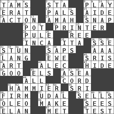 ACROSS 1. Scottish caps 5. R.R. building 8. Frolic 12. Part of Q.E.F. 13. Friends 15. Helper 16. 13-14th century defensive garment 18. Nanny 19. Fastener 20. Plant holder 22. Hard copy producer 24. Whimper 26. To sift 27. South American Indian 28. Call ___ day 29. Compass dir. 32. Make senseless or dizzy 35. Plant excrements 37. Auto club (abbr.) 38. Long (Scottish) 39. She-sheep 40. Indian titles of respect 41. Tate display 42. Actor Baldwin 43. Flintstone garb 44. Thick or sticky substance 45. Raised railways 46. Toward the sea 49. Everything 50. Drawstring 51. More given to overacting 55. Indian title of respect (Mr.) 56. Securely fixed in place 57. Hereditary estate 59. Makes a sale 63. Butter sub 64. Create 65. Perceives with the eye 66. Liveliness 67. Was introduced to 68. Trial DOWN 1. Beverage made from leaves 2. Curve 3. Floor protector 4. Constricting 5. Health resort 6. Pack (down) 7. Having or resembling wings 8. Thick mixture 9. Actor's bit 10. The sixth month of the Jewish calendar 11. Slangy assent 14. Upper-body garments 17. Part of speech 21. Affectionate concern, for short 23. Teachers' org. 25. Artist's stands 28. Medicinal drug used to evoke vomiting 29. Indian skirt 30. Expressed in words 31. Relaxation 32. Volcanic refuse 33. Edible starchy tuberous root 34. To (old English) 36. Deep reverence 40. Most questionable 42. Plant genus of onion and garlic 45. Shade tree 47. Distress signal 48. Blunders 49. ID or VA city 51. Land elevation 52. Length times width 53. Dutch treat 54. Immoral or dissolute person 56. Enemy 58. Allow 60. Area sheltered from the wind 61. French article 62. Fast jet (abbr.)