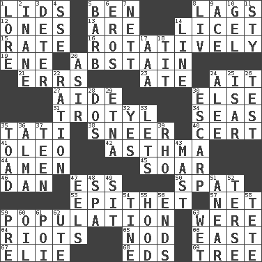 ACROSS 1. Flaplike coverings 5. Benjamin's nick name 8. Straggles 12. Washington bills 13. "We ___ not amused" (Victoria) 14. It is permitted: Lat. 15. Assign a rank or rating to 16. Producing rotation 19. Compass dir. 20. Refrain by choice 21. Blunders 23. Had dinner 24. Small island 27. Helper 30. Otherwise 31. Trinitrotoluene 34. Oceans 35. Jacques of French films 38. Contemptuous expression 40. Certainty 41. Margarine 42. Respiratory problem 44. So be it 45. Fly high 46. One of the 12 tribes of Israel 47. Curvy letter 50. Argument over a trivial matter 53. Curse 57. Fish or hair follower 59. Census information 63. We are 64. Disturbances 65. Dreamland 66. Compass direction 67. Writer Wiesel 68. Begley and Asner 69. Woody plant DOWN 1. Old wives' tales, e.g. 2. Empty; void 3. Prevent from occurring 4. Compass dir. 5. Sharp remark 6. Greek god of love 7. Remaining after all deductions 8. 54 in ancient Rome 9. Adept person 10. Set 11. Filthy place 14. Actor's bit 17. American Automobile Association (abbr.) 18. Teat (slang) 20. SW Saudi Arabia district 22. Food allowance for one day 24. Toward shelter 25. Austrian river, tributary to the Danube 26. Trial 28. Two (Sp.) 29. Inactive volcano in Sicily 30. Fortification 32. Affirmative reply 33. Allows 35. Frog relative 36. _ mater 37. Adolescent 39. 17th letter of the Greek alphabet 43. Vertical spar for supporting sails 47. Snakelike fish 48. Health resort 49. Be seated 51. Approach 52. Laconic 54. Prong on a fork 55. Parka part 56. Extremities 58. False hair 59. Before (prefix) 60. Petroleum 61. Luau course 62. Shoshoni 63. Dripping