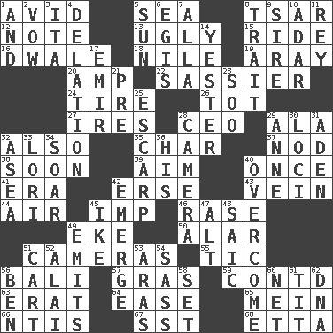 ACROSS 1. Enthusiastic 5. Ocean 8. Russian ruler of old 12. Short letter 13. Unsightly 15. Travel on an animal 16. A sleeping potion; an opiate (poet.) 18. "Death on the ____" 19. Like ___ of sunshine 20. Electrical Unit 22. More impudent 24. Hoop that covers a wheel 26. Small child 27. Angers 28. Corporate head (abbr.) 29. Chicken ___ king 32. In addition 35. Burn to charcoal 37. Dreamland 38. Within a short period 39. Direct toward a target or goal 40. At one time in the past 41. Epoch 42. Celtic language 43. Distinctive style or manner 44. Atmosphere 45. Mischievous child 46. To erase 49. Make supply last 50. Having or resembling wings 51. Devices for capturing images 55. Nervous spasm 56. Indonesian resort city 57. Pate de foie ____ 59. Continued (abbr.) 63. Part of Q.E.F. 64. Comfort 65. Count _ (2 wds.) 66. Nuclear Threat Initiatives 67. Fast jet (abbr.) 68. Singer James DOWN 1. Plus 2. Promise 3. Call ___ day 4. Accusation by an informer 5. Player for Phoenix 6. The front part of a cuirass 7. Silent film actress Nazimova 8. Distinguishing feature 9. Male parent of an animal 10. The sixth month of the Jewish calendar 11. Marina Del _, California 14. Of or pertaining to yesterday 17. Independent ruler or chieftain 21. Before (prefix) 23. "Barney Miller" actor Jack 25. Fortification 28. Device for capturing images 29. Queen of England 1702-14 30. Locales 31. An important port of Yemen 32. At sea 33. Australian parrot (variant) 34. Fly high 36. Part of HMS, perhaps 40. Conquer 42. Develop 45. Eisenhower's nickname 47. The first octave above the treble staff 48. Ketch in the Levant 49. Sends forth 51. Haul 52. Jai ____ 53. Ancient river in northeast Turkey 54. Backtalk 56. Benjamin's nick name 58. Arrange properly for use 60. Fish or hair follower 61. Teat (slang) 62. Heredity factor (abbr.)