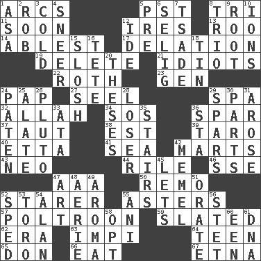 ACROSS 1. Curves 5. Pacific Standard Time (abbr.) 8. Three (prefix) 11. Within a short period 12. Angers 13. Friend of Pooh 14. Most capable 17. Accusation by an informer 19. Keyboard key 21. Foolish or stupid persons 22. Writer of Portnoy's Complaint (1969) 23. Commissioned military rank (abbr.) 24. Infant food 27. Sew up the eyelids of hawks and falcons 29. Health resort 32. Assad's deity 34. Mayday 36. Practice fight 37. Tense 38. Eastern Standard Time (abbr.) 39. Pacific island yam 40. Singer James 41. Ocean 42. Shops 43. Modern: prefix 44. Cause heat under the collar 46. Compass dir. 47. Auto club (abbr.) 50. San ____ (Riviera town) 52. A viewer who gazes fixedly 55. Michaelmas daisies 57. Coward 59. Scheduled 62. Epoch 63. Body of Kaffir warriors 64. Adolescent 65. Spanish title 66. Erode 67. Inactive volcano in Sicily DOWN 1. White ___ sheet 2. Director Reiner 3. Chilled 4. Scornful expression 5. Before (prefix) 6. Major League Baseball Commissioner Bud 7. Sadhe (variant) 8. Musical group of three 9. Carrot, for example 10. Charged particles 12. Binary compound 15. Agitate, as a liquid 16. Wig 18. Metal container 20. College papers 24. Eucharist need 25. Having winglike extensions 26. Greek god of the underworld 28. Failure 29. Practice fights 30. Actors' quests 31. Came up 33. "One Day ___ Time" 35. Flight of steps 36. R.R. building 42. Klaipeda city 45. Allows 47. Nonscientific branch of learning 48. Nest on high 49. Scent 51. Speak pompously 52. Moved rapidly 53. "Corrida" creature 54. ____ Jay Lerner 55. Black tropical American cuckoo 56. Proofreading order 58. Choose 60. Car or cant ending 61. Heredity factor (abbr.)