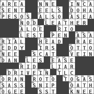 ACROSS 1. Type of rug 5. Compass dir. 8. South American Indian 12. Emitted 13. Snakelike fish 15. Capital of the state of Qatar 16. Mexican monetary units 18. In addition 19. At sea 20. Allow head to fall sleepily 22. Cordwainer's material 24. _ vera 26. River (Sp.) 27. For fear that 28. Fenced enclosure 29. White ___ sheet 32. Monetary unit of Yemen 35. Froth on beer 37. Actress Charlotte 38. Whirlpool 39. Big collection agency 40. "Beetle Bailey" pooch 41. Born 42. Go away! 43. Distinctive style or manner 44. One of the 12 tribes of Israel 45. French article 46. Comfort 49. To free from 50. One who doesn't tell the truth 51. Popular '50s hangout 55. Affectionate concern, for short 56. NW Algerian seaport 57. Printing process, for short 59. Ancient Roman robes 63. Backtalk 64. Clip 65. Pledge 66. Double curve, resembling the letter S 67. Fast jet (abbr.) 68. Leg joint DOWN 1. Viper 2. Portuguese money of account (variant) 3. Followers of ems 4. Without tonality 5. Teachers' org. 6. 1994 drama film starring Jodie Foster 7. Otherwise 8. Potato state 9. Sense of smell 10. "Mermaids" star 11. Auto club (abbr.) 14. Flew 17. Not divided or shared with others 21. Two (Sp.) 23. Shallow baking pan 25. Moral principles 28. Soft color 29. Johnson of "Laugh-In" 30. Suttee (variant) 31. Age 32. Tear apart 33. The content of cognition 34. An important port of Yemen 36. Period 40. Burn the roast 42. Spring feasts 45. 54 in ancient Rome 47. Small island 48. Table seasoning 49. Remove soap 51. To be drawn or hauled along 52. Raze (variant) 53. Charged atoms 54. Nuclear Threat Initiatives 56. Bear (Spanish) 58. Elect 60. Separate the seeds from cotton 61. Had dinner 62. A female animal or person