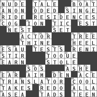 ACROSS 1. Naked 5. Story 9. Water vessel 13. Soon (poet.) 14. Wrote a lyric poem 15. Scorch 16. Travel on an animal 17. Dwellings 19. Gear tooth 20. Electrically charged atom 21. Nervous spasm 22. Eastern Standard Time (abbr.) 23. Egg locale 25. Arrange properly for use 26. Thespian 30. Relationship diagram 34. One or ones belonging to thee 35. The bottom of a shoe or boot 36. He sold his birthright 39. Trials 42. Painter Guido (1575-1642) 43. Tumult 44. Woman's close-fitting hat 46. Merit 47. Fur scarf 48. Mayday 51. American tennis player Robert 54. Ewer handle 57. Direct toward a target or goal 58. Lair 60. Adept person 62. Interpreter 65. Calm and collected 66. Proceeds 67. Do over again 68. Silent film actress Nazimova 69. At sea 70. Bits 71. Adolescent DOWN 1. Drug cop 2. The state of being joined or united 3. Evade 4. Compass dir. 5. "Corrida" creature 6. Arabian gulf 7. French article 8. Proofreads 9. Storage container 10. Single time 11. Eras 12. Trial 15. Religious group 18. Pass on 20. Hankering 24. Titan orbits this 27. Teat (slang) 28. Single 29. Musical pauses 30. Threesomes 31. To separate or throw off 32. Car or cant ending 33. Connecticut Ivy Leaguer 36. Compass dir. 37. R.R. building 38. Wind 40. Small child 41. "Barney Miller" actor Jack 45. ____ Bator 48. Backtalk 49. Petroleum 50. Don Adams' spy role 52. White Person, in Hawaii 53. Learning spot: Fr. 54. Singer James 55. Ancient river in northeast Turkey 56. Immoral or dissolute person 58. Texas town _ City 59. Greek god of love 61. Style 63. Teachers' org. 64. Beverage made from leaves 65. Feline