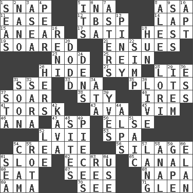 ACROSS 1. Fastener 5. _ tizzy (2 wds.) 8. White ___ sheet 11. Relaxation 12. Cook's measure (abbr.) 14. Infant locale 15. Approach 17. Suttee (variant) 18. Behest 19. Flew 21. Follows as a consequence or result 23. Allow head to fall sleepily 25. It's straight from the horse's mouth 26. Flintstone garb 27. Symbol (abbr.) 28. Falsehood 31. Compass dir. 33. Heredity factor (abbr.) 35. Ground plans 37. Fly high 38. Filthy place 40. Angers 41. Cod relative 43. Actress Gardner 45. Zeal 46. Santa ___, CA 47. Viper 50. Otherwise 52. 57 in ancient Rome 53. Health resort 54. Cause to be 56. Fodder prepared in a silo 61. A type of plum 62. Shade of tan 65. Lessep's creation 66. Erode 67. Observes 68. California wine valley 69. Housemaid (var.) 70. Perceive with the eye 71. Small, secluded valley DOWN 1. Oceans 2. Billionth: prefix 3. Toward the sea 4. Lightbulb-shaped fruit 5. It is 6. Basketball assoc. 7. Michaelmas daisies 8. Toward shelter 9. Backtalk 10. Fitting 13. Abounding in pines 16. Painter Guido (1575-1642) 18. Attila the _ 20. Texas town _ City 22. Simple or foolish person 24. Cub Scout units 26. Possessive pronoun 28. Australian parrot (variant) 29. A whole individual unit 30. Curvy letter 31. Within a short period 32. "Two Mules for Sister ____" 34. "One Day ___ Time" 36. Moving, as bait 37. R.R. building 39. Jacques Cousteau's middle name 42. Polynesian shrub of the pepper family 44. High mountains 48. Settings 49. Parts 51. Ketch in the Levant 52. Area sheltered from the wind 54. Dollar (slang) 55. Round or rotation of duties 57. Long (Scottish) 58. Of or related to the anus 59. Yawn 60. Enthusiasm 61. Ocean 63. Portuguese money of account (variant) 64. Purpose