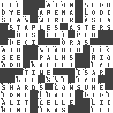ACROSS 1. Snakelike fish 4. Tiny particle 8. Messy guy 12. Color 13. Sports stadium 14. Farming town in central California 15. Oceans 17. One who wires 18. At sea 19. Paper fasteners 21. Michaelmas daisies 23. Part of HMS, perhaps 24. Allow 26. For each 27. Tenth: prefix 28. Mouths or openings 30. Atmosphere 31. A viewer who gazes fixedly 34. Affectionate concern, for short 37. Observe 38. Insides of hands 39. River (Sp.) 40. Find the sum of 41. Place for singles 42. Ingest 43. Prong on a fork 44. Austrian river, tributary to the Danube 46. Set 47. Fast jet (abbr.) 50. Small boy 51. Broken pieces 54. Eat 57. Heavy book 58. Peak District village in England 60. "You Light Up My Life" star Conn 62. Set down 63. Cell (Danish) 64. Cards in a Roman deck? 65. French philosopher Descartes 66. It was, poetically 67. Flowery wreath DOWN 1. Begley and Asner 2. Sight organs 3. Tough but pliablecoriaceous 4. Satellite of Uranus 5. Laconic 6. Single 7. Hindu Mythology: god of death 8. Chalkboards 9. Failure 10. Baltic tributary 11. Prejudice 13. Leather borer 16. Ketch in the Levant 20. 23rd letter of the Greek alphabet 22. Coast Guard woman 25. Singer Mel 27. Passed on 29. Remainder 30. White ___ sheet 31. Connect, as a bridge 32. Falsehoods 33. 100% 34. Excercise machine 35. One who doesn't tell the truth 36. Small bed 41. Uncontrolled 43. Cigar-shaped 44. It is 45. Saudi Arabian king (1953-1964) 46. Homeless child 48. Any of the three canals of the cochlea 49. For Whom the Bell _____ 51. Play the lead 52. Hollow 53. Religious group 55. Born 56. Singer Brickell 59. Morning condensation 61. One more than two