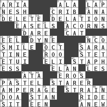 ACROSS 1. Roberta Peters solo 5. In the manner of 8. Infant locale 11. Delicate 12. Baby bed with high sides 13. Santa ___, CA 14. Erase 17. Conveyance 19. Artist's stands 21. Oak nuts 22. Have the gumption 23. Domesticated feline 24. Snakelike fish 27. Unit of force 29. Non-commissioned officer (abbr.) 32. Grin 34. Sep. follower 36. "Two Mules for Sister ____" 37. Prong on a fork 38. Friend of Pooh 39. Proofreading order 40. Needle case 41. Connecticut Ivy Leaguer 42. Staphylococcus 43. Curvy letter 44. Enthusiasm 46. French article 47. "One Day ___ Time" 50. Greek god of love 52. Soft color 55. A viewer who gazes fixedly 57. Electrical Measurement 59. Put through a sieve 62. ___ good deed 63. Comedian Laurel of Laurel & Hardy 64. Travel on an animal 65. Be seated 66. Car or cant ending 67. Afresh DOWN 1. Also 2. Portuguese money of account (variant) 3. Capri or Wright 4. At or in the front 5. "We ___ not amused" (Victoria) 6. Pale purple color 7. Phillipine bananalike plant 8. Den 9. Soon (poet.) 10. Baking dishes 12. Music discs 15. Sadhe (variant) 16. Suggestive of the supernatural 18. Small child 20. Poe poem 24. First name in cosmetics 25. Gives off 26. "_ and Lucy" (Charlie Brown theme song) 28. Learning spot: Fr. 29. Brizilian seaport 30. Streamer paper 31. Curses 33. Flowery wreath 35. Rest room 36. Fast jet (abbr.) 42. Derisive sound 45. Caspian sea tributary 47. Had dinner 48. Laconic 49. Having winglike extensions 51. Spanish missionary in California 52. Groovy apts. 53. Mine, in Marseilles 54. Petty quarrel 55. Elected rep. 56. Precipitation 58. Separate the seeds from cotton 60. Binary compound 61. ___ Haven, CT