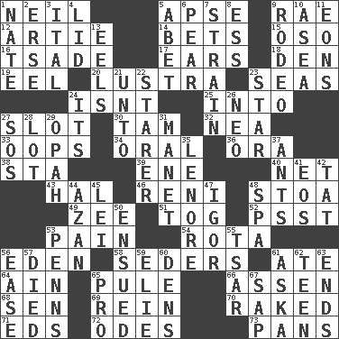 ACROSS 1. Famous astronaut Armstrong 5. Domed church section 9. Actress Charlotte 12. Nick name for Arthur 14. Antes 15. Bear (Spanish) 16. Sadhe (variant) 17. Hearing organs 18. Lair 19. Snakelike fish 20. A period of five years 23. Oceans 24. Is not 25. To the inside or interior of 27. Narrow, elongated depression 30. Scottish cap 32. Teachers' org. 33. I made a mistake 34. Spoken 36. Mouth or opening 38. R.R. building 39. Compass dir. 40. Fish or hair follower 43. Actor Linden 46. Painter Guido (1575-1642) 48. Portico 49. Last letter of the English alphabet 51. Coat; cloak 52. Inconspicuous attention getter 53. Ache 54. Roll call or roster of names 56. Locale of original sin 58. Spring feasts 61. Had dinner 64. The 18th letter of the Arabic alphabet 65. Whine 66. NE Netherlands city 68. Elected rep. 69. It's straight from the horse's mouth 70. Swept the length of 71. Begley and Asner 72. Lyric poems 73. Baking dishes DOWN 1. Nathan's nickname 2. Celtic language 3. Slanted text style (abbr.) 4. Flaplike covering 5. Collude with 6. Lightbulb-shaped fruit 7. Put through a sieve 8. Curvy letter 9. Cowboy competition 10. At sea 11. Immeasurably long periods of time 13. Snakelike fish 21. To (old English) 22. A viewer who gazes fixedly 23. Play the lead 24. ___ a Wonderful Life 26. Modern: prefix 27. Mayday 28. Car dealer's back yard 29. Brightly colored fish 31. French painter Edouard 35. Poe poem 37. Pismires 41. Greek goddess of the dawn 42. Make lace 44. Muslim summons to prayer 45. Luau accessory 47. Composer Stravinsky 48. Health resort 50. Took place subsequently 53. Actor Sean's family 55. Russian ruler of old 56. Comfort 57. Passed on 59. Writer Wiesel 60. Lairs 61. "____ silly question..." 62. Adolescent 63. Conclusions 65. Adept person 67. Plant excrement