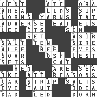 ACROSS 1. Penny 5. Had dinner 8. Mouth or opening 11. Type of rug 12. Hats (slang) 14. Small drink 15. Typical standards 17. Entertaining tales 18. Make lace 19. Contrary to your interests or welfare 21. Ingest 22. Raised railways 23. Area sheltered from the wind 24. It is 25. Elected rep. 27. Put into a specified state 28. SW Saudi Arabia district 31. Table seasoning 35. Nine, plus one 37. Father 38. Toward shelter 39. To riddle 41. Nights before holidays 42. Fly high 43. Order of Saint Francis (abbr.) 45. For fear that 46. Arranges properly for use 47. Domesticated feline 49. Layer 51. "We ___ not amused" (Victoria) 52. Ocean 55. Mamie's husband 57. Small island 60. Thinks logically 62. 4-wheeled motor vehicle 63. Empty completely 65. Table seasonings 66. First lady 67. Tense 68. The main thing one is thinking about 69. Male parent 70. Directed 71. Dormintory (informal) DOWN 1. Lessep's creation 2. Eat (away) 3. Effrontery 4. Docile 5. In the manner of 6. Hoop that covers a wheel 7. Pulitzer Prize-winning author Ferber 8. Clearly or manifestly demonstrative 9. Monetary unit of Yemen 10. Flats, for short 13. Fast planes 16. Indian titles of respect 17. Last 20. Proofreading order 26. Artist's stand 29. Angers 30. Repose 31. Backtalk 32. _ vera 33. Resembling or made to resemble leather 34. Laconic 36. Modern: prefix 40. Fortification 44. Conductor's collection 48. Beverages made from leaves 50. Political cartoonist Thomas 52. Twentieth part of a lira 53. Keyboard key 54. Indian state 55. On the rocks 56. Polynesian shrub of the pepper family 58. Slanted text style (abbr.) 59. Loyal 61. Alleged 64. It would