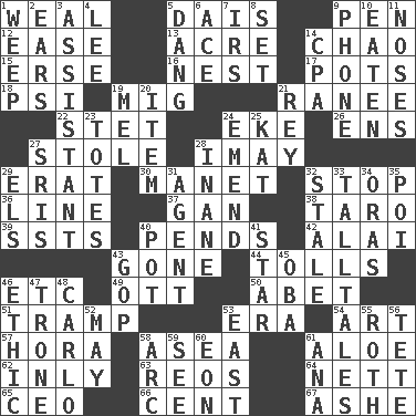 ACROSS 1. Welt 5. Raised platform 9. Fenced enclosure 12. Comfort 13. 43,560 square feet 14. US Secretary of Labor Elaine L. _ 15. Celtic language 16. A home for chicks 17. Cooking vessels 18. 23rd letter of the Greek alphabet 19. Russian fighter aircraft 21. The wife of a rajah (variant) 22. Proofreading order 24. Supplement with great effort 26. Followers of ems 27. Fur scarf 28. "If ____ say so..." 29. Part of Q.E.F. 30. French painter Edouard 32. Halt 36. Actor's bit 37. Separate the seeds from cotton 38. Pacific island yam 39. Fast planes 40. Hangs 42. Jai _ 43. Went 44. For Whom the Bell _____ 46. And so on (abbr.) 49. Baseball player Mel 50. Collude with 51. _____ steamer (cargo ship) 53. Epoch 54. Nonscientific branch of learning 57. Israeli folk dance 58. At sea 61. _ vera 62. Inwardly 63. Vintage cars 64. Remaining after all deductions 65. Corporate head (abbr.) 66. Penny 67. American tennis player Robert DOWN 1. Shed a tear 2. Hearing organs 3. Helper 4. Area sheltered from the wind 5. Mild oath, euphamism for damn 6. Adept person 7. Big collection agency 8. Arrange properly for use 9. Give a jingle 10. Eroded 11. Olfactory organs 14. Numbers guy (abbr.) 19. Cartoonist voice _ Blanc 20. Detail 21. Marina Del _, California 23. Hauls 24. Make improvements or corrections to 25. Krazy ___ of comics 27. Indian titles of respect 28. Lacking in sense or substance 29. Raised railways 31. Representative 32. Showing deterioration from age 33. Baron Munchausen's specialties 34. Mouths or openings 35. Luau course 40. Cooking vessel 41. Play the lead 43. Republican Party 45. Chief or king in Benin or Nigeria 46. Principle of right and wrong 47. Marketplace scale 48. Monte _, Las Vegas Hotel/Casino 52. Fifth month 53. 90 degrees 55. Writer of Portnoy's Complaint (1969) 56. Wig 58. Curve 59. Observe 60. Age 61. Santa ___, CA