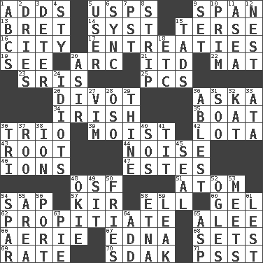 ACROSS 1. Does sums 5. United States Postal Service (abbr.) 9. Connect, as a bridge 13. Cy Young winner Saberhagen 14. System (abbr.) 15. Laconic 16. Municipality 17. Pleas 19. Observe 20. Curve 21. It would 22. Floor covering 23. Indian titles of respect 25. Personal Computers (abbr.) 26. A piece of turf (Scot.) 30. "____ silly question..." 34. From or relating to Ireland 35. Water vessel 36. Musical group of three 39. Wet 42. Globular water bottle used in Asia 43. Carrot, for example 44. Annoying sound 46. Charged atoms 47. _____ Park, CO 48. Order of Saint Francis (abbr.) 51. Tiny particle 54. Plant excrement 57. Apertif with cassis 58. Pipe bend 60. Set 62. Appease 65. Toward shelter 66. Nest on high 67. Pulitzer Prize-winning author Ferber 68. Arranges properly for use 69. Pace 70. Neighbor of Neb. 71. Inconspicuous attention getter DOWN 1. Lettered men learn these first 2. Frees from moisture 3. Prevent from occurring 4. Filthy place 5. One who uses or employs something 6. Synchronize (abbr.) 7. Pacific Standard Time (abbr.) 8. Long narrow piece of something 9. Arrange properly for use 10. Demure 11. At sea 12. A home for chicks 15. Small amounts or degrees 18. And so on (abbr.) 20. SW Saudi Arabia district 24. Foolish or stupid persons 27. Zeal 28. Bear (Spanish) 29. One or ones belonging to thee 30. Most capable 31. "Barney Miller" actor Jack 32. Krazy ___ of comics 33. "One Day ___ Time" 36. Three (prefix) 37. Friend of Pooh 38. Electrically charged atom 40. Distress signal 41. Teat (slang) 45. Lick closed 48. Migrant worker of the '30s 49. Be seated 50. Strips of potato fried in deep fat 52. Stares 53. Confronts 54. Coast Guard woman 55. Length times width 56. Sweet dark-red dessert wine 58. Inactive volcano in Sicily 59. Path through which fluid escapes 61. For fear that 63. Sliced dessert 64. Say or write further 65. Viper