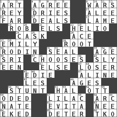 ACROSS 1. Tate display 4. Match 9. Armed conflicts 13. Marina Del _, California 14. Frees from moisture 15. Toward shelter 16. Distant 17. Allots cards 18. Unable to walk 19. Director Reiner 21. Raised railways 22. Sun: prefix 24. Keg 26. Adept person 27. Poet Dickinson 29. Carrot, for example 30. "The Thinker" sculptor 31. Lick closed 33. Ripen 36. _ Lanka 37. Elects 40. Stealthy 41. Car or cant ending 42. Otherwise 43. Failure 45. Singer Brickell 47. Place in a line 48. French article 49. Eras 50. Difficult or unusual or dangerous feat 52. Actor Linden 54. Baseball player Mel 56. Wrote a lyric poem 57. Pale purple color 59. Curve 61. Nathan's nickname 62. Webber/Rice musical 63. Born 64. Supplemented with great effort 65. Prevent from occurring 66. Ring climax DOWN 1. Sandy's bark 2. Rump 3. Polypeptide antibiotic 4. Say or write further 5. Of Greece 6. Monetary unit of Yemen 7. Snakelike fish 8. Curvy letter 9. Place for singles 10. Jai _ 11. San ____ (Riviera town) 12. Perceive with the eye 20. Indonesian resort city 22. White Person, in Hawaii 23. Environmental prefix 25. Synchronize (abbr.) 27. Celtic language 28. Greater amount 29. Raze (variant) 31. Flatfish 32. Greek goddess of the dawn 33. Helper 34. Small, secluded valley 35. Jane of fiction 38. Robbery 39. Volcanic refuse 44. Margarine 45. Dodged 46. Lair 49. Having winglike extensions 50. Neighbor of Neb. 51. False hair 52. Hub of activity 53. Set down 55. Long journey 56. Single 57. Directed 58. Automobile 60. Corporate head (abbr.)