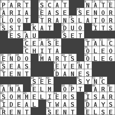 ACROSS 1. Role in a play 5. Go away! 9. Nathan's nickname 13. Operatic vocal solo 14. Comfort 15. Sir (Sp.) 16. Spoils 17. Interpreter 19. Fast jet (abbr.) 20. Krazy ___ of comics 21. Superhero pair 22. ___ a Wonderful Life 23. Son of Isaac 25. Arrange properly for use 26. Desist 30. Baby powder 34. Riviera of "Kiss of the Spider Woman" 35. Margarine 36. Inside; within (prefix) 39. Shops 42. Cassini of fashion 43. Oceans 44. Incident 46. Portable shelter 47. Natives or inhabitants of Denmark 48. Observe 51. Synchronize (abbr.) 54. Santa ___, CA 57. Shade tree 58. Choose 60. "We ___ not amused" (Victoria) 62. Wine waiters 65. Austrian river, tributary to the Danube 66. Perfect 67. It was, poetically 68. 24-hour periods 69. Monthly bill 70. Transmitted 71. Otherwise DOWN 1. Friends 2. Came up 3. Disturbances 4. Make lace 5. Bristle 6. Draw slowly or heavily 7. White ___ sheet 8. Looks after 9. Teachers' org. 10. Opposed to 11. A blast of a horn 12. Blunders 15. Position in a hierarchy or organization 18. Institute legal proceedings 20. Malaysian steamed pastry 24. Buttonhole 27. Direct toward a target or goal 28. R.R. building 29. Having ears or earlike features 30. A girl or young woman (variant) 31. 100% 32. Area sheltered from the wind 33. Gear tooth 36. Eastern Standard Time (abbr.) 37. Born 38. Daniel's nick name 40. Federal power corp. 41. Elected rep. 45. A home for chicks 48. Sew up the eyelids of hawks and falcons 49. Pipe bend 50. Gives off 52. Rhinal 53. Trading vessels 54. SW Saudi Arabia district 55. Thickened enlargement 56. So be it 58. NW Algerian seaport 59. Inconspicuous attention getter 61. Celtic language 63. Floor covering 64. She-sheep 65. Binary compound