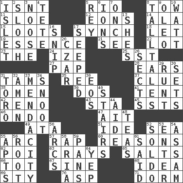 ACROSS 1. Is not 5. River (Sp.) 8. Pull behind 11. A type of plum 12. Immeasurably long periods of time 14. In the manner of 15. Plunders 17. Synchronize (abbr.) 18. Allow 19. Gist 21. Observe 22. Car dealer's back yard 23. Definite Article 24. Ending with capital 25. Fast jet (abbr.) 27. Infant food 28. Hearing organs 31. Scottish caps 35. To separate or throw off 37. A slight indication 38. Presage 39. Two (Sp.) 41. Portable shelter 42. Former U.S. Attorney General Janet 43. R.R. building 45. Fast planes 46. Southwest Nigerian state 47. Small island 49. "One Day ___ Time" 51. Binary compound 52. Ocean 55. Curve 57. Hit sharply and swiftly 60. Thinks logically 62. Luau course 63. Trading vessels 65. Table seasonings 66. Small child 67. Trig term 68. The content of cognition 69. Filthy place 70. Cleo's killer 71. Dormintory (informal) DOWN 1. Small island 2. Make a splashing sound 3. Trap for birds or small mammals 4. False hair 5. Marina Del _, California 6. Charged particles 7. At one time in the past 8. Baron Munchausen's specialties 9. Butter sub 10. Electrical Unit 13. "______ My Girl" (Turtles hit) 16. Sever or remove by pinching or nipping 17. Oozed 20. Russian ruler of old 26. Religious groups 29. Undersized animal 30. Puts into a specified state 31. "Corrida" creature 32. So be it 33. Ananias' fault 34. Snout, nose 36. Greek goddess of the dawn 40. Flight of steps 44. Assistant 48. Afternoon social gatherings 50. Arches 52. Twentieth part of a lira 53. Keyboard key 54. Indian state 55. Flats, for short 56. Carrot, for example 58. Operatic vocal solo 59. Baking dishes 61. Alleged 64. Slangy assent