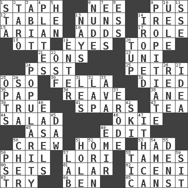 ACROSS 1. Staphylococcus 6. Born 9. Suppuration 12. Eating place 13. Religious women 14. Angers 15. Believer in; advocate of (suffix) 16. Sums up 17. Hero or heavy, e.g. 18. Baseball player Mel 19. Sight organs 20. Drink excessively 21. Immeasurably long periods of time 23. University (slang) 24. Inconspicuous attention getter 25. _ dish (used to culture cells) 28. Bear (Spanish) 30. Chap (slang) 34. Passed on 35. Infant food 36. Rob, plunder, or pillage 38. One (Scot) 39. Loyal 41. Practice fights 43. Afternoon social gathering 44. Vegetable dish 46. Migrant worker of the '30s 48. White ___ sheet 49. Prepare for publication 50. Ship's personnel 51. Residence 53. Possessed 56. Silvers or Donahue 57. Australian parrot (variant) 58. Corrects by punishment or discipline 60. Arranges properly for use 61. Having or resembling wings 62. Ancient Celtic tribe of eastern Britain 63. Attempt 64. Benjamin's nick name 65. 2nd pers. sing. pres. of can (arch.) DOWN 1. R.R. building 2. Pacific island yam 3. "This won't hurt ____!" 4. Food holders 5. Layer 6. Naked 7. Conclusions 8. Double-curved letter 9. Appease 10. Ubangi River tributary 11. Compass dir. 13. Negative votes 14. Pressed 19. Keyboard key 20. Uncastrated adult male sheep 22. Order of Saint Francis (abbr.) 24. Teen's desire 26. French philosopher Descartes 27. It may be bright or harebrained 28. Chooses 29. "Two Mules for Sister ____" 31. French article 32. Infant locale 33. Actress Gardner 37. Eat (away) 40. Artist's stands 42. What Jean-Claude Killy likes to do 45. Fool 47. New York city 49. Arab leader 50. "Mermaids" star 51. Hollow 52. Northwest Algerian city 54. So be it 55. Hiding places for outlaws 56. Pacific Standard Time (abbr.) 57. Experiment locale 58. Nervous spasm 59. Be seated