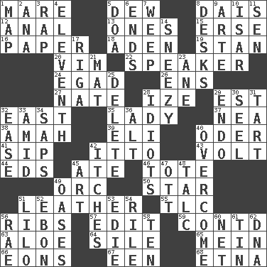 ACROSS 1. Female horse 5. Morning condensation 8. Raised platform 12. Of or related to the anus 13. Singles 15. Celtic language 16. Some stationery 18. An important port of Yemen 19. Comedian Laurel of Laurel & Hardy 20. Zeal 22. Orator 24. Mild oath 26. Followers of ems 27. Nathan's nickname 28. Ending with capital 29. Eastern Standard Time (abbr.) 32. Compass direction 35. Kenny Rogers chart-topper in '80 37. Teachers' org. 38. Housemaid 39. Biblical high priest 40. Baltic tributary 41. Small drink 42. "Tell ____ the Marines!" 43. Electrical Unit 44. Begley and Asner 45. Had dinner 46. Carry 49. The grampus (Milton) 50. Play the lead 51. Cordwainer's material 55. Affectionate concern, for short 56. Teases 57. Prepare for publication 59. Continued (abbr.) 63. Medicinal plant 64. Filth; sediment 65. Count _ (2 wds.) 66. Immeasurably long periods of time 67. Car or cant ending 68. Inactive volcano in Sicily DOWN 1. Atlas unit 2. Santa ___, CA 3. Hit sharply and swiftly 4. Veterans Day date 5. ___ good deed 6. Conclusions 7. Shed a tear 8. Writing tables 9. Johnson of "Laugh-In" 10. Austrian river, tributary to the Danube 11. Elected rep. 14. Dwarf with a sinus problem 17. Port city in Latvia 21. Floor protector 23. A saturated hydrocarbon 25. Erase 28. Foolish or stupid persons 29. Inside; within (prefix) 30. Stitch closed the eyes of (a falcon) 31. Small pie 32. Relaxation 33. Among 34. Plant excrements 36. Keyboard modifier key 40. Conquer 42. Irritating cutaneous sensations 45. Nonscientific branch of learning 47. Baseball player Mel 48. Baby powder 49. Fertile tracts in a desert 51. _ and Stitch 52. Inky black, to poets 53. Singer Brickell 54. Cause heat under the collar 56. Actress Charlotte 58. "___ Little Indians" 60. Fish or hair follower 61. Metal container 62. Heredity factor (abbr.)