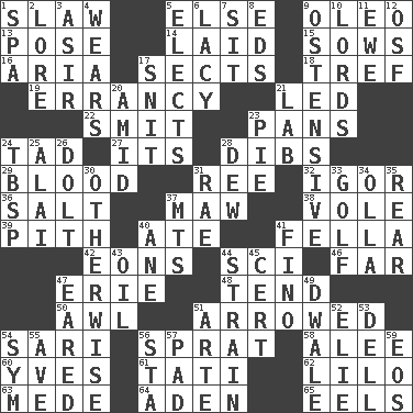ACROSS 1. Cole _ (cabbage dish) 5. Otherwise 9. Margarine 13. Introduce or present, as a question 14. Put down 15. Sty mamas 16. Roberta Peters solo 17. Religious groups 18. Not kosher 19. The state or an instance of erring 21. Directed 22. Stricken, poetically 23. Baking dishes 24. Small boy 27. It is 28. Claim 29. Vital fluid 31. To sift 32. Russian composer Stravinsky 36. Table seasoning 37. Opening into something insatiable 38. Short-tailed, large-bodied rat 39. Essential or central part 40. Had dinner 41. Man or boy (slang) 42. Immeasurably long periods of time 44. _-fi 46. Distant 47. One of the Great Lakes 48. Be inclined (to) 50. Leather borer 51. Moved like an arrow 54. Indian skirt 56. Small fatty European fish 58. Toward shelter 60. Jacques Cousteau's middle name 61. Jacques of French films 62. _ and Stitch 63. Ancient Persian 64. An important port of Yemen 65. Snakelike fish DOWN 1. Health resort 2. Old wives' tales, e.g. 3. SW Saudi Arabia district 4. Puts on (as clothing) 5. Chooses 6. Made of lace 7. Be seated 8. Begley and Asner 9. Clearly or manifestly demonstrative 10. Titled peers of a realm 11. She-sheep 12. Order of Saint Francis (abbr.) 17. In a ____ (agitated or irritated) 20. Among 21. Experiment locale 23. Sliced dessert 24. Cook's measure (abbr.) 25. Mountain range southwest of Kyrgyzstan 26. Dunce 28. Morning condensation 30. Else 31. Actress Charlotte 33. Eighteen holes 34. Rounded earthenware pot or jar 35. Bring up, as a child 37. Mountains (abbr.) 40. One (Scot) 41. A pale, very dry sherry 43. Petroleum 44. Put through a sieve 45. Foregone conclusion 47. Having ears or earlike features 49. A sleeping potion; an opiate (poet.) 51. Johnson of "Laugh-In" 52. Writer Wiesel 53. Small valley 54. Symbol (abbr.) 55. "___ Maria" 56. R.R. building 57. Writing tablet 59. Greek goddess of the dawn