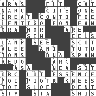 ACROSS 1. Caspian sea tributary 5. Biblical high priest 8. Feline 11. Drug cop 12. Quote 14. Single 15. Relatively large 17. Continued (abbr.) 18. Enemy 19. Small, flat, pigmented spot on the skin 21. Age 22. Air blower 23. Mouth or opening 24. Not either 25. "We ___ not amused" (Victoria) 27. Elected rep. 28. Snakelike fish 31. Desk light 35. Perceive with the eye 37. Highlander 38. Toward shelter 39. Cuckoo 41. Ballerina skirt 42. Charged atoms 43. Heredity factor (abbr.) 45. Connect, as a bridge 46. Redecorate 47. Curve 49. White ___ sheet 51. Teachers' org. 52. Be seated 55. The grampus (Milton) 57. Car dealer's back yard 60. Substance 62. Luau course 63. Peter (Polish) 65. Leg joints 66. Small child 67. A type of plum 68. Incision 69. Filthy place 70. R.R. building 71. Indian titles of respect DOWN 1. White American of non-Hispanic descent 2. Less widely known 3. Sports stadium 4. Get outta here! 5. Environmental prefix 6. Actor's bit 7. "Tell ____ the Marines!" 8. Java holder (2 wds.) 9. Small Philippine buffalo 10. Adolescent 13. Pulitzer Prize-winning author Ferber 16. Canisters 17. Pupil covering 20. Moves 26. Musical pauses 29. Globular water bottle used in Asia 30. Surprise greatly 31. Den 32. Medicinal plant 33. Ananias' fault 34. Mexican monetary units 36. Conclude 40. More lacking in sense or substance 44. Ancient Greek god of war 48. Keg 50. High mountains 52. Contemptuous expression 53. Ancient Celtic tribe of eastern Britain 54. Trials 55. Chooses 56. Carrot, for example 58. Petroleums 59. A blast of a horn 61. Extremities 64. Afternoon social gathering