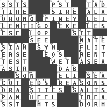 ACROSS 1. Fast planes 5. Pacific Standard Time (abbr.) 8. Small boy 11. Become fatigued 12. Father 14. Insect wing 15. U. of Maine site 17. Abounding in pines 18. Flowery wreath 19. Small, flat, pigmented spot on the skin 21. Make supply last 22. French article 23. Compass dir. 24. Trim (branches) 25. Be seated 27. Perceive with the eye 28. Nathan's nickname 31. Thailand, formerly 35. Symbol (abbr.) 37. Sudden quick movement 38. Celtic language 39. Greek goddess of the dawn 41. Monthly bill 42. Trial 43. Soggy 45. Toward the sea 46. SW Saudi Arabia district 47. Apply (a substance) by light strokes 49. Male child 51. Biblical high priest 52. Ocean 55. Small bed 57. Begley and Asner 60. Thinks logically 62. Mouth or opening 63. Locates 65. Table seasonings 66. Baking dish 67. The bottom of a shoe or boot 68. It may be bright or harebrained 69. Fast jet (abbr.) 70. Mountains (abbr.) 71. Dormintory (informal) DOWN 1. Fur scarf 2. Begets 3. Marketplace scale 4. Posted 5. Air pressure measure (abbr.) 6. Trig term 7. Long journey 8. Baron Munchausen's specialties 9. Toward shelter 10. Raised platform 13. Snake ____ (dice throw) 16. Petroleums 17. Wimpy's pal 20. Moves 26. Kind of red light 29. Prong on a fork 30. Singer James 31. Bristle 32. Angers 33. Helper 34. Paris' subway 36. Cut the grass 40. Spring feasts 44. Lie 48. Prejudice 50. Tender 52. Twentieth part of a lira 53. Keyboard key 54. Indian state 55. 911 reaches them 56. Mouths or openings 58. South Vietnam president (1954) 59. Proofreading order 61. Alleged 64. Raised railways