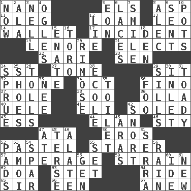 ACROSS 1. Billionth: prefix 5. Raised railways 8. Viper 11. Cassini of fashion 12. Rich soil 13. Lion 14. Place for singles 17. Event 19. Poe poem 21. Opts 22. Indian skirt 23. Elected rep. 24. Fast jet (abbr.) 27. Heavy book 29. Be seated 32. Give a jingle 34. Sep. follower 36. Fine (Spanish) 37. Hero or heavy, e.g. 38. "Barney Miller" actor Jack 39. Water jar 40. Ubangi River tributary 41. Biblical high priest 42. Having a sole or soles 43. Double-curved letter 44. Style 46. Filthy place 47. _ moment's notice (2 wds.) 50. Greek god of love 52. Soft color 55. A viewer who gazes fixedly 57. Electrical Measurement 59. Put through a sieve 62. ___ good deed 63. Proofreading order 64. Travel on or in a vehicle 65. Title for a knight 66. Car or cant ending 67. Afresh DOWN 1. At this time 2. Wing 3. 1994 drama film starring Jodie Foster 4. Stares at amorously 5. A really long time 6. Shoestrings 7. Grin 8. Actor Baldwin 9. Transmitted 10. Cooking vessels 12. Whopper 15. Maternal 16. "Corrida" creature 18. Lair 20. Full of chinks, cracks, or crevices 24. Disorder 25. Imelda's hoard 26. For Whom the Bell _____ 28. Learning spot: Fr. 29. Beverly of Met fame 30. An arm off of a larger body of water 31. Sycophant 33. Born 35. Rest room 36. Egg _ yung 42. Derisive sound 45. Caspian sea tributary 47. Had dinner 48. Laconic 49. Having winglike extensions 51. Spanish missionary in California 52. Groovy apts. 53. Mine, in Marseilles 54. Coast Guard woman 55. Arrange properly for use 56. Precipitation 58. Commissioned military rank (abbr.) 60. Binary compound 61. ___ Haven, CT