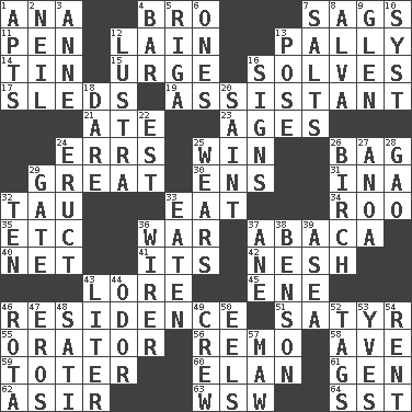 ACROSS 1. Santa ___, CA 4. Sis' sibling 7. Settles 11. Animal enclosure 12. (Had) reclined 13. Friendly 14. Metal container 15. Goad 16. Finds the solution 17. Bobsleighs 19. Aide 21. Had dinner 23. Grows older 24. Blunders 25. Victory 26. Paper or plastic container 29. Relatively large 30. Followers of ems 31. _ tizzy (2 wds.) 32. The 19th letter of the Greek alphabet 33. Ingest 34. Friend of Pooh 35. And so on (abbr.) 36. Armed conflict 37. Phillipine bananalike plant 40. Fish or hair follower 41. It is 42. Soft 43. Old wives' tales, e.g. 45. Compass dir. 46. Dwelling 51. Man with strong sexual desires 55. Speaker 56. San ____ (Riviera town) 58. "___ Maria" 59. Carrier 60. Enthusiasm 61. Commissioned military rank (abbr.) 62. SW Saudi Arabia district 63. Compass dir. 64. Fast jet (abbr.) DOWN 1. Tenement units (abbr.) 2. Famous astronaut Armstrong 3. Queen of England 1702-14 4. Long, evenly shaped piece 5. Port city in Latvia 6. Washington bills 7. Table seasonings 8. Inventor's middle name 9. Small, secluded valley 10. System (abbr.) 12. A period of five years 13. Introduce or present, as a question 16. Signals 18. Have the gumption 20. Inhabitant of Heaven 22. Eastern Standard Time (abbr.) 24. Spew [out] 25. Puts on (as clothing) 26. A tree used for making furniture 27. Small Philippine buffalo 28. E Mali city 29. Yard entry 32. Nine, plus one 33. Consumed 36. One who wires 37. A saturated hydrocarbon 38. Gillaume's butler role 39. Toward the sea 43. 61 cubic inches 44. Aroma 46. Round or rotation of duties 47. Greek god of love 48. Suttee (variant) 49. Ship's personnel 50. Snakelike fish 52. Labels 53. Jacques Cousteau's middle name 54. Monthly bill 57. Opening into something insatiable