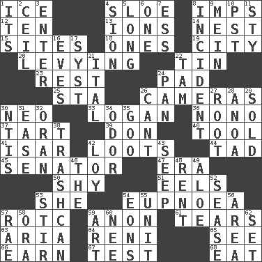 ACROSS 1. Frozen water 4. A type of plum 8. Naughty children 12. "___ Little Indians" 13. Charged particles 14. Egg locale 15. Locates 18. Singles 19. Municipality 20. Imposing or collecting, as a tax 22. Shallow baking pan 23. Take ten 24. Writing tablet 25. R.R. building 26. Devices for capturing images 30. Modern: prefix 33. Utah city north of Ogden 36. Words to Nanette 37. Small pie 39. Spanish title 40. Utensil 41. Austrian river, tributary to the Danube 42. Plunders 44. Small amount or degree 45. Legislator 47. Period 50. Like a shrinking violet 51. Snakelike fish 53. A female animal or person 54. Normal relaxed breathing 57. College mil. group 59. At once, immediately (arch.) 61. Separates forcefully 63. Roberta Peters solo 64. Painter Guido (1575-1642) 65. Perceive with the eye 66. Merit 67. Trial 68. Erode DOWN 1. It is 2. To provide with a ceiling 3. Keyboard key 4. The Jewish people; Israel 5. Having great length 6. Single 7. Double-curved letter 8. Happening 9. Count _ (2 wds.) 10. Pacific Standard Time (abbr.) 11. Filthy place 16. Nights before holidays 17. System (abbr.) 21. Slanted text style (abbr.) 22. Scottish cap 24. Baking dish 26. Patter 27. Carrot, for example 28. Small Philippine buffalo 29. Disposed of to a purchaser 30. Nuclear Threat Initiatives 31. Comfort 32. NW Algerian seaport 34. Scent 35. Thick or sticky substance 38. File 13 42. Myrna of the movies 43. Ooze 46. Definite Article 48. Monthly bill 49. Medicinal plant 52. Gospel singer Marvin 53. Move through with a circular motion 54. Immeasurably long periods of time 55. A single undivided whole 56. Length times width 57. Actress Charlotte 58. Mouth or opening 59. Tate display 60. Born 62. Arrange properly for use