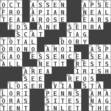 ACROSS 1. Sep. follower 4. NE Netherlands city 9. Domed church section 13. Back 14. Bee-related 15. Be tempered by heat 16. Beverage made from leaves 17. Came up 18. Hearing organs 19. Begley and Asner 21. One (Scot) 22. Spanish missionary in California 24. Scram! 26. Label 27. Add up to 29. Rowboat 30. U. of Maine site 31. Mine, in Marseilles 33. Cleo's killer 36. E Mali city 37. Gist 40. Ocean 41. Everything 42. Remaining after all deductions 43. Musical pauses 45. Length times width 47. From or relating to Ireland 48. Perceive with the eye 49. Vintage cars 50. Failure 52. By way of 54. R.R. building 56. Australian parrot (variant) 57. Actor Sean's family 59. Wet nurse (var.) 61. Mouths or openings 62. Locates 63. Tired old horse 64. Portable shelter 65. An arm off of a larger body of water 66. Definite Article DOWN 1. Often (poetically) 2. Algonquian 3. Inedible or poisonous agaric 4. American Automobile Association (abbr.) 5. Small fatty European fish 6. The Jewish people; Israel 7. Comfort 8. Compass dir. 9. Disorder of the immune system 10. Lightbulb-shaped fruit 11. "Two Mules for Sister ____" 12. Raised railways 20. Examine hastily 22. Unemotional 23. Hearing organ 25. _ vera 27. Ancient Roman robe 28. Spoken 29. Do not 31. Toward the sea 32. Was introduced to 33. Aide 34. Puts into a specified state 35. Romantic infatuation 38. Scornful expression 39. 4th largest of the Great Lakes 44. Greek god of love 45. Help 46. To separate or throw off 49. The wife of a rajah (variant) 50. Old wives' tales, e.g. 51. NW Algerian seaport 52. Distinctive style or manner 53. International (abbr.) 55. Nursemaid 56. Car dealer's back yard 57. Air pressure measure (abbr.) 58. Fast jet (abbr.) 60. Personal question