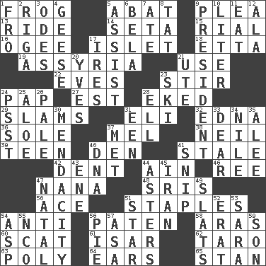 ACROSS 1. Tree-dwelling hopper 5. Blind as ____ 9. Entreaty 13. Travel on an animal 14. Bristle 15. Monetary unit of Yemen 16. Double curve, resembling the letter S 17. Small island 18. Singer James 19. Nineveh was its capital 21. Purpose 22. Nights before holidays 23. Agitate 24. Infant food 27. Eastern Standard Time (abbr.) 28. Made supply last 29. Criticizes harshly 31. Biblical high priest 32. Pulitzer Prize-winning author Ferber 36. Not divided or shared with others 37. Cartoonist voice _ Blanc 38. Famous astronaut Armstrong 39. Adolescent 40. Lair 41. Showing deterioration from age 42. Gouge 44. The 18th letter of the Arabic alphabet 46. To riddle 47. Nanny 48. Indian titles of respect 50. Adept person 51. Paper fasteners 54. Against 56. Eucharist need 58. Ancient river in northeast Turkey 60. Go away! 61. Austrian river, tributary to the Danube 62. Pacific island yam 63. More than one (prefix) 64. Hearing organs 65. Comedian Laurel of Laurel & Hardy DOWN 1. Back 2. Port city in Latvia 3. Lyric poems 4. Honkers 5. Aid 6. Actor Lugosi 7. Had dinner 8. Make lace 9. Elected leader of a country 10. 61 cubic inches 11. Consume 12. Chicken ___ king 17. Angers 20. Jacques Cousteau's middle name 21. Shoshoni 23. What Jean-Claude Killy likes to do 24. Inconspicuous attention getter 25. _ vera 26. Light colored 28. Pipe bend 30. Ananias' fault 31. Car or cant ending 33. Letter starter 34. The longest river in the world 35. Toward shelter 37. Was introduced to 40. Heredity factor (abbr.) 41. Sever or remove by pinching or nipping 43. Compass dir. 44. Michaelmas daisies 45. SW Asia republic 47. Brizilian seaport 49. Narrow boards 51. Play the lead 52. Part of Q.E.F. 53. "Two Mules for Sister ____" 54. Cleo's killer 55. Non-commissioned officer (abbr.) 56. Sliced dessert 57. White ___ sheet 59. Manchild