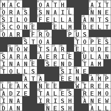 ACROSS 1. Apple computer (short form) 4. Pledge 8. Small island 11. Mouths or openings 13. Slow-paced one 15. Compass dir. 16. Grain storage tower 17. Man or boy (slang) 18. Pismires 19. Biscuitlike quick bread 21. Shade tree 22. Waist strap 23. Rowing implement 24. Away 27. Festering 29. Portico 30. Drinks excessively 34. Immediately 36. Russian ruler of old 39. Dodge 40. "Two Mules for Sister ____" 41. Nest on high 43. ____ Bator 44. Lacking in sense or substance 46. Post 47. Scottish cap 48. For Whom the Bell _____ 49. Trig term 51. "One Day ___ Time" 53. Car or cant ending 54. Electrical Unit 57. Path through which fluid escapes 60. Born 63. One who wires 65. Edge tool used to cut and shape wood 66. Stories 69. San ____ (Riviera town) 70. _ tizzy (2 wds.) 71. From or relating to Ireland 72. Afresh 73. One of the 12 tribes of Israel 74. Tender 75. 100% DOWN 1. With motion or animation 2. N. Chile seaport 3. Bodily heat indicating an inflammation 4. Order of Saint Francis (abbr.) 5. A saturated hydrocarbon 6. Falsehood 7. Land elevation 8. Singer Murray 9. International (abbr.) 10. Trial 12. Male offspring 14. Desk light 18. Utter; complete 20. Lizard (obsolete) 25. Roll call or roster of names 26. Fertile tracts in a desert 28. Shoshoni 29. Tchaikovsky ballet 31. Monetary unit of Botswana 32. Dutch treat 33. Elected rep. 34. Billionth: prefix 35. Of the mouth 37. "We ___ not amused" (Victoria) 38. Remove soap 40. Be seated 42. Singer Brickell 45. Eastern Standard Time (abbr.) 50. Compass dir. 52. Opposed to 54. Sports stadium 55. Klaipeda city 56. Move like a hungry wolf 57. Put down 58. Pulitzer Prize-winning author Ferber 59. Muslim summons to prayer 61. Merit 62. Writer Wiesel 64. Retirement account (abbr.) 67. Double-curved letter 68. Quiet!