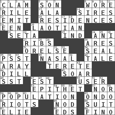 ACROSS 1. Dollar (slang) 5. Male child 8. Had on 12. Cause heat under the collar 13. Insect wing 14. Begets 15. Give off 16. Homes 19. Car or cant ending 20. Of or relating to Laos or its people 21. Bristle 23. Indiana (abbr.) 24. Cuckoo 27. Chest bones 30. Ancient Greek god of war 31. Threatening words 34. Lick closed 35. Inconspicuous attention getter 38. Relating to the nose 40. Story 41. Like ___ of sunshine 42. Cigar-shaped 44. Deli pickle 45. Fly high 46. Fast jet (abbr.) 47. Eastern Standard Time (abbr.) 50. One who makes use of a thing 53. Curse 57. Not either 59. Census information 63. Southwest Nigerian state 64. Debaucheries 65. Dreamland 66. Set or collection 67. Writer Wiesel 68. Begley and Asner 69. Fine (Spanish) DOWN 1. Algonquian 2. Citrus fruits 3. Place in a line 4. Was introduced to 5. "Two Mules for Sister ____" 6. Butter sub 7. Political cartoonist Thomas 8. Acquire through effort 9. The grampus (Milton) 10. To riddle 11. Double-curved letter 14. Post 17. One more than two 18. One of the 12 tribes of Israel 20. Den 22. Trinitrotoluene 24. Length times width 25. Anneal 26. Capri or Wright 28. Benjamin's nick name 29. Narrow board 30. Michaelmas daisies 32. Compass dir. 33. Hearing organs 35. Writing tablets 36. Indian titles of respect 37. Table seasoning 39. Lion 43. Drawn tight 47. Snakelike fish 48. Health resort 49. Teat (slang) 51. World-weariness 52. "The Thinker" sculptor 54. Prong on a fork 55. Parka part 56. Conclusions 58. Printing process, for short 59. Before (prefix) 60. Lubricate 61. Luau course 62. Shoshoni 63. Order of Saint Francis (abbr.)