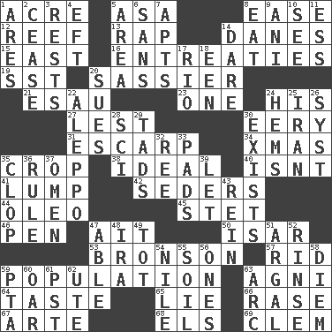 ACROSS 1. 1/640 square mile 5. White ___ sheet 8. Comfort 12. Coral collection 13. Hit sharply and swiftly 14. Natives or inhabitants of Denmark 15. 90 degrees 16. Pleas 19. Fast jet (abbr.) 20. More impudent 21. He sold his birthright 23. Single 24. Part of HMS, perhaps 27. For fear that 30. Suggestive of the supernatural 31. Fortification 34. Dec. holiday 35. Riding implement 38. Perfect 40. Is not 41. Mass 42. Spring feasts 44. Margarine 45. Proofreading order 46. Writing instrument 47. Small island 50. Austrian river, tributary to the Danube 53. "Death Wish" actor 57. To free from 59. Census information 63. Hindu god of fire 64. Clothes sense 65. Whopper 66. To erase 67. Johnson of "Laugh-In" 68. Raised railways 69. To starve (Brit.) DOWN 1. Ancient Greek god of war 2. Desist 3. Musical pauses 4. Bank Draft (abbr.) 5. Type of rug 6. Without 7. Tenement units (abbr.) 8. Ingest 9. Cuckoo 10. Observe 11. Curvy letter 14. Have the gumption 17. River (Sp.) 18. Car or cant ending 20. Takes to court 22. City in Syria 24. Equivocates 25. SW Asia republic 26. System (abbr.) 28. _-fi 29. Small boys 30. Is extant 32. To separate or throw off 33. Writing tablets 35. Hoof sound 36. Governing power 37. Sign of something about to happen 39. Allow 43. It's straight from the horse's mouth 47. Competent 48. Retirement account (abbr.) 49. Small child 51. Therefore, facetiously 52. Remove soap 54. Mediterranean tributary 55. Land 56. Washington bills 58. South Vietnam president (1954) 59. Parent Teacher Assoc. 60. Boat paddle 61. Pacific Standard Time (abbr.) 62. Shoshoni 63. Curve