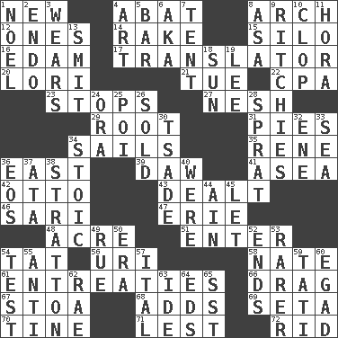 ACROSS 1. ___ Haven, CT 4. Blind as ____ 8. Bowlike part 12. Washington bills 14. Libertine 15. Grain storage tower 16. Dutch treat 17. Interpreter 20. Australian parrot (variant) 21. Third day of the wk. 22. Tax preparer (abbr.) 23. Halts 27. Soft 29. Carrot, for example 31. Sliced desserts 34. Moves on water 35. French philosopher Descartes 36. 90 degrees 39. Fool 41. At sea 42. Von Bismarck 43. Started a card game 46. Indian skirt 47. One of the Great Lakes 48. 43,560 square feet 51. Keyboard key 54. Make lace 56. RI univ. 58. Nathan's nickname 61. Pleas 66. To be drawn or hauled along 67. Portico 68. Sums up 69. Bristle 70. Prong on a fork 71. For fear that 72. To free from DOWN 1. Christmas carol 2. Inside; within (prefix) 3. Erodes 4. Nonscientific branch of learning 5. Long, evenly shaped piece 6. Alias (abbr.) 7. Portable shelter 8. White ___ sheet 9. Actors Guy, Robert Welles, and Clint 10. Hoof sound 11. Israeli folk dance 13. Stricken, poetically 18. Player for Phoenix 19. Area sheltered from the wind 24. Mouth or opening 25. Luau course 26. Disposed of to a purchaser 28. Small fatty European fish 30. Sadhe (variant) 32. Compass dir. 33. Ocean 34. Unemotional 36. Greek goddess of the dawn 37. _ moment's notice (2 wds.) 38. Ski resort town in Vermont 40. We are 44. The 18th letter of the Arabic alphabet 45. Allow 49. Regret 50. Epoch 52. Conclusions 53. More uncommon 54. Trial 55. Against 57. Slanted text style (abbr.) 59. Jacques of French films 60. Mild oath 62. Actress Charlotte 63. Binary compound 64. Begley and Asner 65. Fast jet (abbr.)