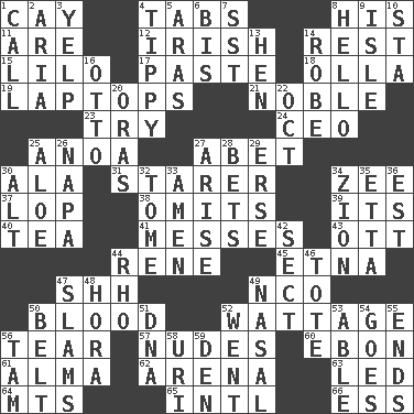 ACROSS 1. Island 4. Bar bills 8. Part of HMS, perhaps 11. "We ___ not amused" (Victoria) 12. From or relating to Ireland 14. Relief 15. _ and Stitch 17. Thick mixture 18. Spanish pot 19. Portable computers 21. Having high moral qualities 23. Attempt 24. Corporate head (abbr.) 25. Small Philippine buffalo 27. Collude with 30. Insect wing 31. A viewer who gazes fixedly 34. Last letter of the English alphabet 37. Chop off 38. Leaves out 39. ___ a Wonderful Life 40. Afternoon social gathering 41. Makes clutter 43. Baseball player Mel 44. French philosopher Descartes 45. Inactive volcano in Sicily 47. Quiet! 49. Non-commissioned officer (abbr.) 50. Vital fluid 52. Electrical Measurement 56. Separate forcefully 57. Unadorned figures 60. Inky black, to poets 61. _ mater 62. Sports stadium 63. Directed 64. Mountains (abbr.) 65. International (abbr.) 66. Double-curved letter DOWN 1. Give a ring to 2. Operatic vocal solo 3. Sharp bark 4. Likely to tip or tilt 5. Caspian sea tributary 6. Again 7. Fast jet (abbr.) 8. Phone greeting 9. Small island 10. R.R. building 13. Layer 14. Loose flowing garment 16. "Beetle Bailey" pooch 20. Mouths or openings 22. Sep. follower 25. _ vera 26. California wine valley 27. Ascend 28. Wagers 29. Celtic language 30. The first octave above the treble staff 32. Heavy book 33. So be it 34. The Jewish people; Israel 35. Singer James 36. Eastern Standard Time (abbr.) 42. Religious group 44. 17th letter of the Greek alphabet 46. Carryall 47. Hits or strikes with great force 48. Israeli folk dance 49. Rhinal 50. Waist strap 51. Heredity factor (abbr.) 52. Left 53. Competent 54. Travels 55. Conclusions 56. Scottish cap 58. RI univ. 59. Lair