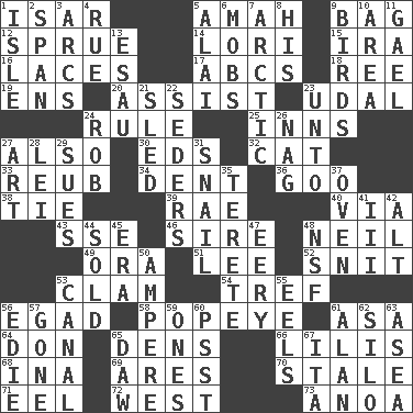ACROSS 1. Austrian river, tributary to the Danube 5. Wet nurse 9. Container for groceries 12. Upset 14. Australian parrot (variant) 15. Retirement account (abbr.) 16. Shoestrings 17. Lettered men learn these first 18. To sift 19. Followers of ems 20. Aid 23. Hereditary estate 24. Governing power 25. Restaurants 27. In addition 30. Begley and Asner 32. Feline 33. Reuben's nickname 34. Gouge 36. Thick or sticky substance 38. Neckwear 39. Actress Charlotte 40. By way of 43. Compass dir. 46. Father 48. Famous astronaut Armstrong 49. Mouth or opening 51. Area sheltered from the wind 52. In a ____ (agitated or irritated) 53. Burrowing marine mollusk 54. Unclean, religiously 56. Mild oath 58. Wimpy's pal 61. White ___ sheet 64. Spanish title 65. Lairs 66. Ms. Damita and namesakes 68. _ tizzy (2 wds.) 69. Ancient Greek god of war 70. Lacking originality or spontaneity 71. Snakelike fish 72. 270 degrees 73. Small Philippine buffalo DOWN 1. Capri or Wright 2. Connect, as a bridge 3. Arches 4. Sorrow 5. Mountain range southwest of Kyrgyzstan 6. Disorderly crowds 7. Northern region 8. Part of HMS, perhaps 9. Avian creatures 10. Length times width 11. Highlander 13. Son of Isaac 21. Downhill vehicle 22. Spring feasts 23. To (old English) 24. Director Reiner 26. Tired old horse 27. Nonscientific branch of learning 28. Flowery wreath 29. Takes to court 31. Slow-paced one 35. Cigar-shaped 37. Baking chamber 41. One more than two 42. The first octave above the treble staff 44. Exchanged or delivered for money 45. Period 47. Suggestive of the supernatural 48. Science/research agcy. 50. Electrical Unit 53. Lessep's creation 55. Snakelike fish 56. Singer Brickell 57. Went 59. Singles 60. Inconspicuous attention getter 61. ____ Jay Lerner 62. Grain storage tower 63. At sea 65. Fool 67. Call ___ day