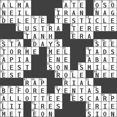 ACROSS 1. _ mater 5. Had dinner 8. Bear (Spanish) 11. Famous astronaut Armstrong 12. SW Asia republic 13. Tired old horse 14. Erase 17. One of the two male reproductive glands 19. A period of five years 21. Cigar-shaped 22. Hyperbolic tangent 23. Period 24. R.R. building 27. 24-hour periods 29. Perceive with the eye 32. Singer Mel 34. Cartoonist voice _ Blanc 36. Small amounts or degrees 37. Capital of Western Samoa 38. Compass dir. 39. Blind as ____ 40. For fear that 41. Male child 42. Grin 43. Compass dir. 44. Hero or heavy, e.g. 46. Born 47. Strike 50. Monetary unit of Yemen 52. Prior to 55. Gossips 57. One to whom something is allotted 59. Fortification 62. Cards in a Roman deck? 63. Angers 64. 4th largest of the Great Lakes 65. Was introduced to 66. Age 67. The Jewish people; Israel DOWN 1. Added to 2. Area sheltered from the wind 3. Place where flour is made 4. Eskimo relative 5. "We ___ not amused" (Victoria) 6. Clothes sense 7. Keyboard key 8. Single time 9. Table seasoning 10. Double curve, resembling the letter S 12. Call ___ day 15. Sadhe (variant) 16. Inactive volcano in Sicily 18. Lyricist Gershwin 20. Poems 24. Having lost freshness 25. Drinks excessively 26. Originate 28. Sir (Sp.) 29. Unit of acoustic absorption 30. Peak District village in England 31. First name in cosmetics 33. Floor covering 35. Poe poem 36. Scottish cap 42. Theater features 45. Actor's bit 47. Friend of Pooh 48. Nick name for Arthur 49. Stone: prefix 51. Shoestrings 52. Lip ointment 53. Writer Wiesel 54. Secret move to avoid paying debts 55. Consenting reply 56. Indian skirt 58. Car or cant ending 60. _ de Janeiro 61. Writing instrument