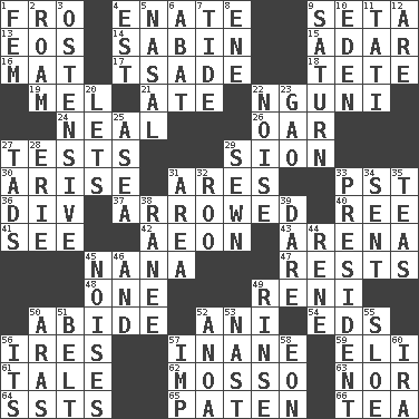 ACROSS 1. From 4. Maternal 9. Stalk of a moss capsule 13. Greek goddess of the dawn 14. Unit of acoustic absorption 15. The sixth month of the Jewish calendar 16. Floor covering 17. Sadhe (variant) 18. False hair 19. Cartoonist voice _ Blanc 21. Had dinner 22. Group of southern Bantu languages 24. Anneal 26. Rowing implement 27. Trials 29. The Jewish people; Israel 30. Ascend 31. Ancient Greek god of war 33. Pacific Standard Time (abbr.) 36. HTML Container Element 37. Moved like an arrow 40. Portuguese money of account (variant) 41. Observe 42. Period of immesurable duration 43. Sports stadium 45. Nanny 47. Musical pauses 48. Single 49. Painter Guido (1575-1642) 50. Stay 52. Black tropical American cuckoo 54. Begley and Asner 56. Angers 57. Empty; void 59. Connecticut Ivy Leaguer 61. Falsehood 62. With motion or animation 63. Or not 64. Fast planes 65. Eucharist need 66. Afternoon social gathering DOWN 1. Opposite of masc. 2. Wander 3. Clearly or manifestly demonstrative 4. Eastern Standard Time (abbr.) 5. Rhinal 6. Blind as ____ 7. Periodic rise and fall of the sea level 8. Compass dir. 9. Titan orbits this 10. Genesis locale 11. Jacques of French films 12. "We ___ not amused" (Victoria) 20. Allows 22. Annoying sound 23. E Mali city 25. Toward the sea 27. Bits 28. One of the Great Lakes 29. Stitched 31. Type of rug 32. Friend of Pooh 33. Elected leader of a country 34. Emitted 35. Beverages made from leaves 38. The wife of a rajah (variant) 39. Have the gumption 44. French philosopher Descartes 45. Annoying sounds 46. Also 49. Wash lightly 50. Ancient river in northeast Turkey 51. Waist strap 52. Small Philippine buffalo 53. Political cartoonist Thomas 55. _ gin 56. ___ a Wonderful Life 57. Mischievous child 58. Period of immesurable duration 60. Lyricist Gershwin