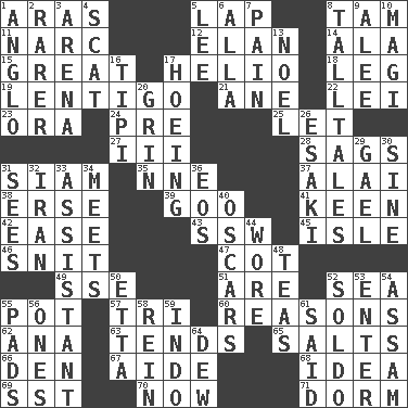 ACROSS 1. Caspian sea tributary 5. Pet locale 8. Scottish cap 11. Drug cop 12. Flair 14. In the manner of 15. Relatively large 17. Sun: prefix 18. Part of a journey 19. Small, flat, pigmented spot on the skin 21. One (Scot) 22. Luau accessory 23. Mouth or opening 24. Before (prefix) 25. Allow 27. One more than two 28. Droops 31. Thailand, formerly 35. Compass dir. 37. Mountain range southwest of Kyrgyzstan 38. Celtic language 39. Thick or sticky substance 41. Peachy ____! 42. Relaxation 43. Compass dir. 45. Capri or Wright 46. In a ____ (agitated or irritated) 47. Small bed 49. Compass dir. 51. "We ___ not amused" (Victoria) 52. Ocean 55. Plant holder 57. Three (prefix) 60. Thinks logically 62. Santa ___, CA 63. Looks after 65. Table seasonings 66. Lair 67. Helper 68. The content of cognition 69. Fast jet (abbr.) 70. Immediately 71. Dormintory (informal) DOWN 1. White American of non-Hispanic descent 2. More valued for its uncommonness 3. Sports stadium 4. Get outta here! 5. Area sheltered from the wind 6. Silent film actress Nazimova 7. Ache 8. Baron Munchausen's specialties 9. Toward shelter 10. Wise men 13. Christmas carol 16. Native american tent (variation) 17. Cultivating 20. Amused look 26. 1973 Nobel Price Winner (Physics) Leo 29. Highlander 30. Trig term 31. Perceives with the eye 32. SW Asia republic 33. Aide 34. Confronts 36. Greek goddess of the dawn 40. Motion picture awards 44. Had on 48. Afternoon social gatherings 50. Singer James 52. Twentieth part of a lira 53. Keyboard key 54. Indian state 55. Writing tablets 56. Washington bills 58. It's straight from the horse's mouth 59. _ china 61. Expressed in words 64. Morning condensation