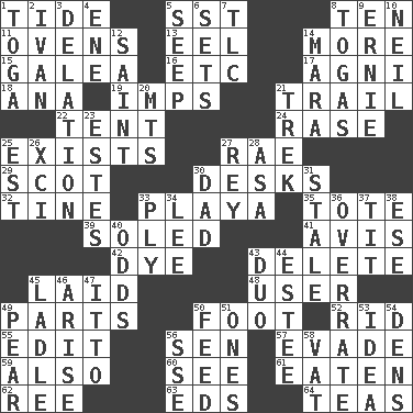 ACROSS 1. Periodic rise and fall of the sea level 5. Fast jet (abbr.) 8. Nine, plus one 11. Baking chambers 13. Snakelike fish 14. Greater amount 15. An organ shaped like a helmet 16. And so on (abbr.) 17. Hindu god of fire 18. Santa ___, CA 19. Naughty children 21. Get behind 22. Portable shelter 24. To erase 25. Is extant 27. Actress Charlotte 29. Native of Scotland 30. Writing tables 32. Prong on a fork 33. Beach, in Buenos Aires 35. Haul 39. Having a sole or soles 41. Deliberation 42. Color 43. Erase 45. Put down 48. One who uses or employs something 49. Pieces 50. Lowest support of a structure 52. To free from 55. Prepare for publication 56. Elected rep. 57. Dodge 59. In addition 60. Observe 61. Eroded 62. To separate or throw off 63. Begley and Asner 64. Beverages made from leaves DOWN 1. Ancient Roman robe 2. _ the terrible 3. Accusation by an informer 4. Compass dir. 5. Ooze 6. Arranges properly for use 7. Affectionate concern, for short 8. Ancient Roman robes 9. Bert's buddy 10. Famous astronaut Armstrong 12. Inhabitant of Heaven 14. Hindu Mythology: god of death 20. Mountains (abbr.) 21. Long journey 23. _____ Park, CO 25. Eastern Standard Time (abbr.) 26. One more than ninety 27. Marina Del _, California 28. White ___ sheet 30. June honoree 31. Having lost freshness 33. Strand of rope, yarn or thread 34. Area sheltered from the wind 36. Make much ado about nothing 37. Teat (slang) 38. Compass dir. 40. Probability 43. Superhero pair 44. First name in cosmetics 45. Dipping utensil 46. Originate 47. "Tell ____ the Marines!" 49. Lightbulb-shaped fruit 50. Nourish 51. Washington bills 53. The content of cognition 54. Hiding places for outlaws 56. Compass dir. 58. Large container