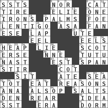 ACROSS 1. Fast planes 5. Or not 8. Domesticated feline 11. Hoop that covers a wheel 12. Writer Wiesel 14. Single 15. Removes the wrinkles 17. Insides of hands 18. Enemy 19. Small, flat, pigmented spot on the skin 21. White ___ sheet 22. Avid follower 23. Compass dir. 24. Infant locale 25. Shoshoni 27. Snakelike fish 28. Snakelike fish 31. Pile 35. Falsehood 37. Highlander 38. Celtic language 39. Compass dir. 41. Ballerina skirt 42. Political cartoonist Thomas 43. Eastern Standard Time (abbr.) 45. Connect, as a bridge 46. Commotion 47. Small bed 49. Be seated 51. Had dinner 52. Ocean 55. Small child 57. Consume 60. Thinks logically 62. Santa ___, CA 63. Columnist Joseph or Stewart 65. Table seasonings 66. Lair 67. Bring up, as a child 68. The main thing one is thinking about 69. Fast jet (abbr.) 70. Epoch 71. Dormintory (informal) DOWN 1. Vertical member of a panel or frame 2. Begets 3. Heavy duty weighing machine 4. Transmitted 5. Teachers' org. 6. Rounded earthenware pot or jar 7. Basketball hoops 8. Java holder (2 wds.) 9. Small Philippine buffalo 10. Adolescent 13. Son of Isaac 16. Filth; sediment 17. Cotton for raincoats, e.g. 20. Highlander 26. Trials 29. Globular water bottle used in Asia 30. Surprise greatly 31. Coop moms 32. Part of Q.E.F. 33. Helper 34. _ dish (used to culture cells) 36. Compass dir. 40. Fortification 44. Haul 48. Beverages made from leaves 50. Separate forcefully 52. Twentieth part of a lira 53. Keyboard key 54. Indian state 55. Small amounts or degrees 56. Washington bills 58. Toward shelter 59. Russian ruler of old 61. Alleged 64. Mouth or opening