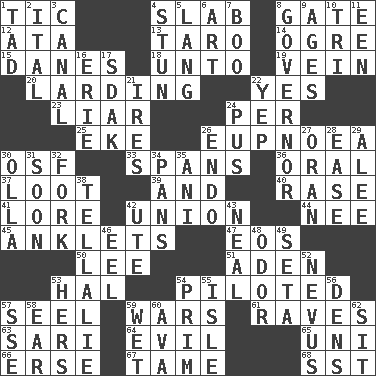 ACROSS 1. Nervous spasm 4. Thick slice 8. Yard entry 12. _ moment's notice (2 wds.) 13. Pacific island yam 14. Legendary monster 15. Natives or inhabitants of Denmark 18. To (old English) 19. Distinctive style or manner 20. Preparing or cooking with lard 22. Consenting reply 23. One who doesn't tell the truth 24. For each 25. Supplement with great effort 26. Normal relaxed breathing 30. Order of Saint Francis (abbr.) 33. Connects, as a bridge 36. Taken by mouth 37. Spoils 39. Also 40. Raze (variant) 41. Old wives' tales, e.g. 42. The state of being joined or united 44. Born 45. Short socks 47. Greek goddess of the dawn 50. Area sheltered from the wind 51. An important port of Yemen 53. Actor Linden 54. Manned the helm 57. Sew up the eyelids of hawks and falcons 59. Armed conflicts 61. All-night dance parties 63. Indian skirt 64. Morally bad or wrong 65. Corn or form start 66. Celtic language 67. Docile 68. Fast jet (abbr.) DOWN 1. Small boy 2. Slanted text style (abbr.) 3. Lessep's creation 4. Astound 5. Long (Scottish) 6. Nonscientific branch of learning 7. Sometimes accompanies a hiss 8. State head 9. Matures 10. Three (prefix) 11. Car or cant ending 16. 4th largest of the Great Lakes 17. Neighbor of Neb. 21. Angers 22. Slangy assent 24. Ichor 26. Inside; within (prefix) 27. Northwest Algerian city 28. Relaxation 29. Toward shelter 30. Spanish pot 31. Within a short period 32. Tined utensil 34. Zero-star reviews 35. Black tropical American cuckoo 38. Copy Pinocchio 42. Shoshoni 43. Actress Patricia 46. Snakelike fish 48. Scent 49. Bristle 52. Mole, birthmark 53. Possessive pronoun 54. Demure 55. Small island 56. Cub Scout units 57. Compass dir. 58. Hearing organ 59. Dripping 60. Actress Gardner 62. Be seated