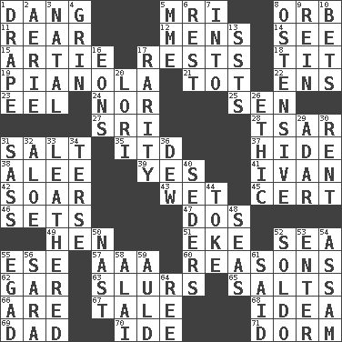 ACROSS 1. Mild oath, euphamism for damn 5. Medical imaging device (abbr.) 8. Globe 11. Hitchcock's "____ Window" 12. Not women's 14. Perceive with the eye 15. Nick name for Arthur 17. Musical pauses 18. Teat (slang) 19. Player piano 21. Small child 22. Followers of ems 23. Snakelike fish 24. Or not 25. Elected rep. 27. Indian title of respect (Mr.) 28. Russian ruler of old 31. Table seasoning 35. It would 37. Flintstone garb 38. Toward shelter 39. It is so 41. _ the terrible 42. Fly high 43. Dripping 45. Sure thing 46. Arranges properly for use 47. Two (Sp.) 49. Layer 51. Supplement with great effort 52. Ocean 55. Compass dir. 57. American Automobile Association (abbr.) 60. Thinks logically 62. Slender fish 63. Disparaging remarks 65. Table seasonings 66. "We ___ not amused" (Victoria) 67. Lie 68. The content of cognition 69. Male parent 70. Binary compound 71. Dormintory (informal) DOWN 1. Window treatment 2. Nest on high 3. Relating to or accompanying birth 4. Amused look 5. Madame (abbr.) 6. State of inaction 7. To the inside or interior of 8. Clearly or manifestly demonstrative 9. It's straight from the horse's mouth 10. Wagers 13. Fast planes 16. Immeasurably long periods of time 17. Noteworthy scarcity 20. Australian parrot (variant) 26. Value system 29. The sixth month of the Jewish calendar 30. Monthly bill 31. Backtalk 32. _ vera 33. Resembling or made to resemble leather 34. Laconic 36. Morning condensation 40. Spring feasts 44. Puff or smoke 48. Oceans 50. Political cartoonist Thomas 52. Twentieth part of a lira 53. Keyboard key 54. Indian state 55. Mild oath 56. "Two Mules for Sister ____" 58. Jai _ 59. Old (Scot.) 61. Alleged 64. Portuguese money of account (variant)