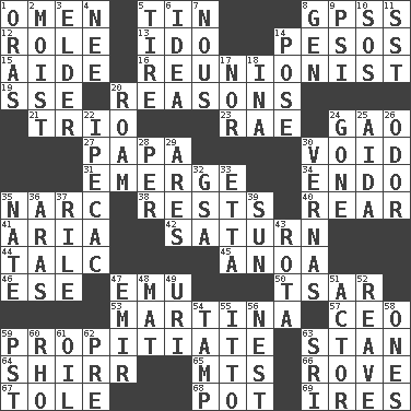 ACROSS 1. Sign of things to come 5. Shallow baking pan 8. Global Positioning Systems (abbr.) 12. Hero or heavy, e.g. 13. Wedding promise 14. Mexican monetary units 15. Helper 16. One who advocates reunion 19. Compass dir. 20. Thinks logically 21. Musical group of three 23. Actress Charlotte 24. E Mali city 27. Dad 30. State of nonexistence 31. Develop 34. Inside; within (prefix) 35. Drug cop 38. Musical pauses 40. Bring up, as a child 41. Operatic vocal solo 42. Titan orbits this 44. Baby powder 45. Small Philippine buffalo 46. Compass dir. 47. Australian flightless bird 50. Russian ruler of old 53. Chrissie's court nemesis 57. Corporate head (abbr.) 59. Appease 63. Comedian Laurel of Laurel & Hardy 64. Bake eggs in their shells 65. Mountains (abbr.) 66. Be footloose 67. Lacquered or enameled metalware 68. Plant holder 69. Angers DOWN 1. Mouths or openings 2. Damp 3. A person who is older than you are 4. Born 5. Become fatigued 6. It may be bright or harebrained 7. Common sense 8. Commissioned military rank (abbr.) 9. Air pressure measure (abbr.) 10. Distress signal 11. Fast jet (abbr.) 14. Introduce or present, as a question 17. And not 18. _ tizzy (2 wds.) 20. Wander 22. Medicinal drug used to evoke vomiting 24. Went 25. Opera by Verdi 26. Aroma 28. For each 29. Ancient Greek god of war 30. Actresses Bloom and Felton 32. Girls' org. (abbr.) 33. Singer James 35. Nathan's nickname 36. Caspian sea tributary 37. Cause heat under the collar 39. Player for Phoenix 43. Round or rotation of duties 47. Arab leader 48. Floor covering 49. RI univ. 51. Thespian 52. Rob, plunder, or pillage 54. Pack (down) 55. "Tell ____ the Marines!" 56. Egg locale 58. Washington bills 59. Pacific Standard Time (abbr.) 60. 17th letter of the Greek alphabet 61. Lubricate 62. Before (prefix) 63. Indian title of respect (Mr.)