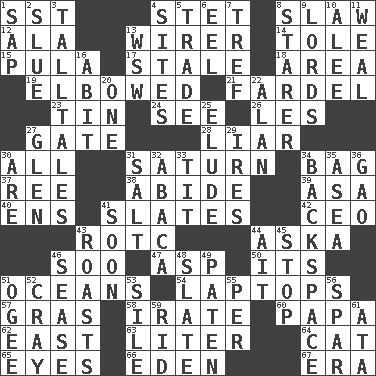 ACROSS 1. Fast jet (abbr.) 4. Proofreading order 8. Cole _ (cabbage dish) 12. Chicken ___ king 13. One who wires 14. Lacquered or enameled metalware 15. Monetary unit of Botswana 17. Having lost freshness 18. Type of rug 19. Turned at an angle; bent 21. Pack 23. Shallow baking pan 24. Perceive with the eye 26. French article 27. Yard entry 28. One who doesn't tell the truth 30. Everything 31. Titan orbits this 34. Paper or plastic container 37. Portuguese money of account (variant) 38. Tolerate 39. White ___ sheet 40. Followers of ems 41. Chalkboards 42. Corporate head (abbr.) 43. College mil. group 44. "____ silly question..." 46. "Barney Miller" actor Jack 47. Cleo's killer 50. ___ a Wonderful Life 51. Seas 54. Portable computers 57. Pate de foie ____ 58. Feeling or showing extreme anger 60. Dad 62. Compass direction 63. 61 cubic inches 64. Domesticated feline 65. Sight organs 66. Paradise 67. Epoch DOWN 1. Plant excrement 2. Turn sharply 3. Baron Munchausen's specialties 4. Locates 5. Buy and sell 6. Snakelike fish 7. Unclean, religiously 8. A viewer who gazes fixedly 9. Nobles 10. Toward shelter 11. Welt 13. Compass dir. 16. "This won't hurt ____!" 20. Single 22. ____ Jay Lerner 25. Evade 27. Small, secluded valley 29. Angers 30. "We ___ not amused" (Victoria) 31. Table seasoning 32. Phillipine bananalike plant 33. Teat (slang) 34. Keyboard key 35. Toward the sea 36. E Mali city 41. Within a short period 43. Ridicules or criticizes harshly 44. Small island 45. Constrict 46. Gospel singer Marvin 48. Schedule 49. Eucharist need 51. Double curve, resembling the letter S 52. Supercomputer manufacturer 53. Filth; sediment 55. For each 56. Practice fight 59. To free from 61. _ moment's notice (2 wds.)