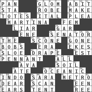 ACROSS 1. Baking dish 4. Seize upon or latch onto something 8. "This won't hurt ____!" 12. R.R. building 13. Loose flowing garment 14. Cause to be 15. Hauls 18. Slanted text style (abbr.) 19. Entreaty 20. Chrissie's court nemesis 22. Opposite of masc. 23. One who doesn't tell the truth 24. Slender fish 25. Compass dir. 26. Legislator 30. Definite Article 33. Biscuitlike quick bread 36. Went 37. Moves up and down 39. Epoch 40. Makes supply last 41. A type of plum 42. Window treatment 44. Eastern Standard Time (abbr.) 45. Pre-World Series prize 47. 100% 50. Actress Gardner 51. The visible part of the earth's surface 53. Had dinner 54. Pertaining to the sea 57. Southeast Asian peninsula 59. "Two Mules for Sister ____" 61. Paris' subway 63. Letter starter 64. Glance over 65. Car or cant ending 66. Hearing organs 67. Portable shelter 68. To riddle DOWN 1. Pacific Standard Time (abbr.) 2. Smallest unit of an element 3. Relating to or accompanying birth 4. Broad smile 5. Globular water bottle used in Asia 6. Chief or king in Benin or Nigeria 7. Cartoonist voice _ Blanc 8. Electrical Measurement 9. Lip ointment 10. D.D.E's nickname 11. Afternoon social gathering 16. 4th largest of the Great Lakes 17. Comedian Laurel of Laurel & Hardy 21. Angers 22. Avid follower 24. Turn to the right 26. Fastener 27. Casino tip 28. Washington bills 29. Respite 30. Cook's measure (abbr.) 31. Opening into or through something 32. Inky black, to poets 34. An absolute certainty 35. Mouth or opening 38. Legislators 42. Heredity factor (abbr.) 43. Comfort 46. "___ Maria" 48. Rich soil 49. Actor's bit 52. 61 cubic inches 53. The sixth month of the Jewish calendar 54. NW Algerian seaport 55. Patter 56. Algonquian 57. Binary compound 58. Teachers' org. 59. Fast jet (abbr.) 60. Adept person 62. Single