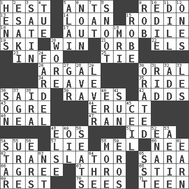 ACROSS 1. Command 5. Pismires 9. Redecorate 13. Son of Isaac 14. Grant temporary use of 15. "The Thinker" sculptor 16. Nathan's nickname 17. Car 19. What Jean-Claude Killy likes to do 20. Victory 21. Globe 22. Raised railways 23. Information 25. Make a knot 26. Therefore, facetiously 30. Spoken 34. Break or tear apart 35. Travel on or in a vehicle 36. Stated 39. All-night dance parties 42. Does sums 43. Legendary monster 44. Spew [out] 46. Be tempered by heat 47. The wife of a rajah (variant) 48. Greek goddess of the dawn 51. It may be bright or harebrained 54. Institute legal proceedings 57. Falsehood 58. Cartoonist voice _ Blanc 60. Born 62. Interpreter 65. "Two Mules for Sister ____" 66. Match 67. Through, poetically 68. Agitate 69. Respite 70. Observes 71. Adolescent DOWN 1. Coop moms 2. 1973 Nobel Price Winner (Physics) Leo 3. Smooth fabric 4. Third day of the wk. 5. Jai _ 6. Part of speech 7. Make lace 8. Snout, nose 9. Director Reiner 10. Singer Brickell 11. Deli pickle 12. Washington bills 15. Loose flowing garment 18. Medical imaging device (abbr.) 20. Had on 24. Pack 27. Slender fish 28. Actress Gardner 29. Prying instrument 30. Declaimed 31. To free from 32. Find the sum of 33. French article 36. Boy, to dad 37. Personal question 38. Lyricist Gershwin 40. Period 41. Player for Phoenix 45. To provide with a ceiling 48. Otherwise 49. Lubricate 50. Theater features 52. Maternal 53. Nest on high 54. Play the lead 55. Goad 56. Hearing organs 58. Greater amount 59. Greek god of love 61. Merit 63. Fish or hair follower 64. Definite Article 65. Fast jet (abbr.)