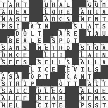 ACROSS 1. Small pie 5. Mountain range 9. Chewing product 12. Length times width 13. Old wives' tales, e.g. 14. Operatic vocal solo 15. Vertical spar for supporting sails 16. Lettered men learn these first 17. Left 18. Air pressure measure (abbr.) 19. The 18th letter of the Arabic alphabet 21. Narrow boards 22. Dunce 24. "We ___ not amused" (Victoria) 26. The 19th letter of the Greek alphabet 27. Memphis, Tenn. Street 28. Blemish 29. Without 30. Paris' subway 32. Portico 36. At one time in the past 37. Cards in a Roman deck? 38. (Had) reclined 39. Perceives with the eye 40. Exchanges for money 42. Silent film actress Nazimova 43. Louse (plural) 44. Vices 46. White ___ sheet 49. Choose 50. Patter 51. Remove all contents or possession from 53. Baseball player Mel 54. Small island 57. Ketch in the Levant 58. Cassini of fashion 61. _ vera 62. Toward shelter 63. Hitchcock's "____ Window" 64. Not women's 65. Cartoonist voice _ Blanc 66. Quote 67. Inconspicuous attention getter DOWN 1. Pack (down) 2. Caspian sea tributary 3. Home 4. Make lace 5. Uhlan (variant) 6. Director Reiner 7. Curve 8. French article 9. Relatively large 10. National forest in Provo, Utah 11. Taiwanese island in East China Sea 14. Leather borer 19. Everything 20. A whole individual unit 21. Arrange properly for use 23. Fertile tracts in a desert 24. Showery time 25. Friend of Pooh 27. Object of repulsion 28. Vertical member of a panel or frame 29. Mayday 31. Opt 32. Killed 33. Baron Munchausen's specialties 34. Petroleums 35. Santa ___, CA 40. Small drink 41. Religious group 43. Chop off 45. Large container 46. Indian state 47. Showing deterioration from age 48. Satellite of Uranus 52. Frozen water 53. Legendary monster 55. Charged particles 56. Trial 58. The grampus (Milton) 59. Flowery wreath 60. Ingest 61. Electrical Unit
