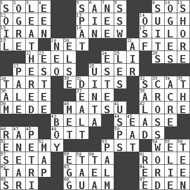 ACROSS 1. Not divided or shared with others 5. Without 9. Distress signal 12. Double curve, resembling the letter S 13. Sliced desserts 14. Ending for "Through" and "Enough" 15. SW Asia republic 16. Afresh 17. Grain storage tower 18. Allow 19. Fish or hair follower 21. Following 22. Person who is morally reprehensible 24. Connecticut Ivy Leaguer 26. Compass dir. 27. Mexican monetary units 28. One who uses or employs something 29. Small pie 30. Prepares for publication 32. Go away! 36. Toward shelter 37. Compass dir. 38. Bowlike part 39. Ancient Persian 40. Taiwanese island in East China Sea 42. Old wives' tales, e.g. 43. Actor Lugosi 44. Gospel singer Marvin 46. Hit sharply and swiftly 49. Baseball player Mel 50. Writing tablets 51. Foe 53. Pacific Standard Time (abbr.) 54. Dripping 57. Stalk of a moss capsule 58. Singer James 61. Hero or heavy, e.g. 62. Canvas cover 63. Highlander 64. 4th largest of the Great Lakes 65. Indian title of respect (Mr.) 66. Island territory of the United States 67. Paradise DOWN 1. The visible part of the earth's surface 2. Legendary monster 3. Tough but pliablecoriaceous 4. Car or cant ending 5. Petty quarrel 6. The 18th letter of the Arabic alphabet 7. Born 8. Compass dir. 9. Costumes for special activities 10. Stares 11. Dinah or Pauly 14. Order of Saint Francis (abbr.) 19. Modern: prefix 20. Otherwise 21. Wind 23. First name in cosmetics 24. _____ Park, CO 25. French article 27. Diluted with white 28. National forest in Provo, Utah 29. Scottish cap 31. Started a card game 32. Vegetable dish 33. What you're doing now 34. Measure of real estate 35. Definite Article 40. Was introduced to 41. United States Postal Service (abbr.) 43. Male child 45. Ingest 46. Musical pauses 47. Approach 48. _ dish (used to culture cells) 52. Atlas unit 53. Inside of hand 55. Writer Wiesel 56. Adolescent 58. Ovum 59. The 19th letter of the Greek alphabet 60. Afternoon social gathering 61. To riddle