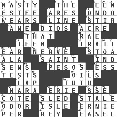 ACROSS 1. Offensive 6. Definite Article 9. Car or cant ending 12. First name in cosmetics 13. Ancient Greek god of war 14. Southwest Nigerian state 15. Erodes 16. Actor's bit 17. Tumult 18. One (Scot) 19. "Vaya con ____" 20. Measure of real estate 21. Not this but _ 23. Actress Charlotte 24. Adolescent 25. Distinguishing feature 28. Ewer handle 30. Boldness 34. Portico 35. Wing 36. Inhabitant of Heaven 38. Indiana (abbr.) 39. Elected reps. 41. Mexican monetary units 43. Double-curved letter 44. Trials 46. Petroleums 48. Infant locale 49. Ballerina skirt 50. Hindu Mythology: god of death 51. 4th largest of the Great Lakes 53. Compass dir. 56. ____ d'Azur (French Riviera) 57. Downhill vehicle 58. Having lost freshness 60. Scent 61. Small island 62. Bert's buddy 63. For each 64. Marina Del _, California 65. Artist's stand DOWN 1. ___ Haven, CT 2. Toward the sea 3. Comedian Laurel of Laurel & Hardy 4. Cylindrical with tapered ends 5. It is so 6. Musical group of three 7. Coop moms 8. Compass dir. 9. Pleas 10. Singer Brickell 11. And not 13. Set down 14. Motion picture awards 19. Natives or inhabitants of Denmark 20. Tate display 22. Layer 24. Interpreter 26. Charged particles 27. Small boys 28. Compass direction 29. Toward shelter 31. Strike 32. Compete 33. Followers of ems 37. Woman's close-fitting hat 40. A viewer who gazes fixedly 42. Be seated 45. Health resort 47. A period of five years 49. Periodic rise and fall of the sea level 50. Method 51. Otherwise 52. Have confidence or faith in 54. Without 55. Writer Wiesel 56. Police officer (slang) 57. Title for a knight 58. Observe 59. Snakelike fish